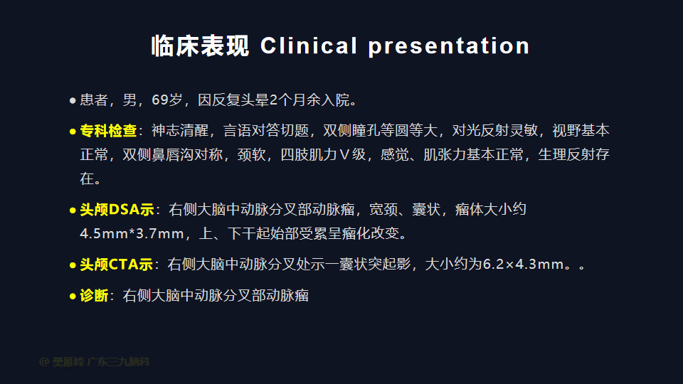 在这段手术视频中,展示了一名69岁男性的病例,他因反复头晕2个月发现的大脑中动脉动脉瘤