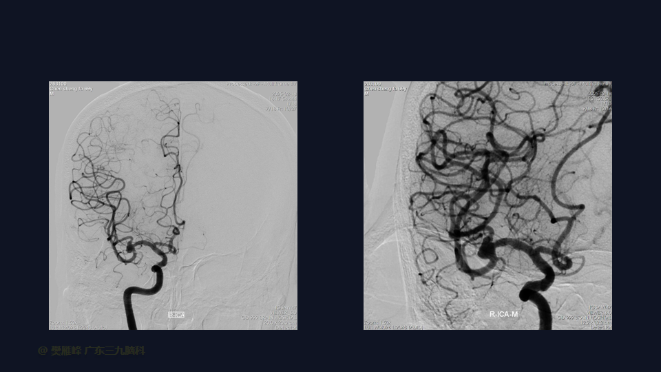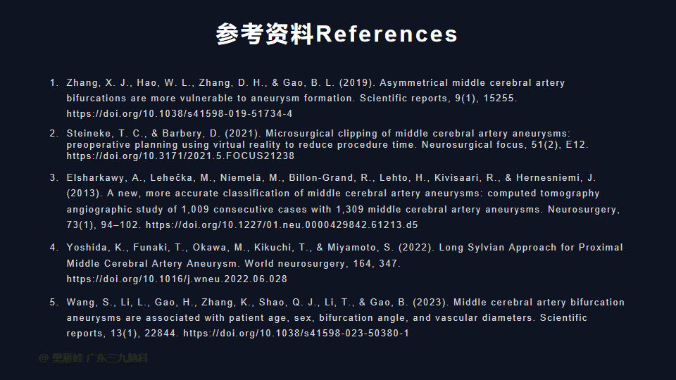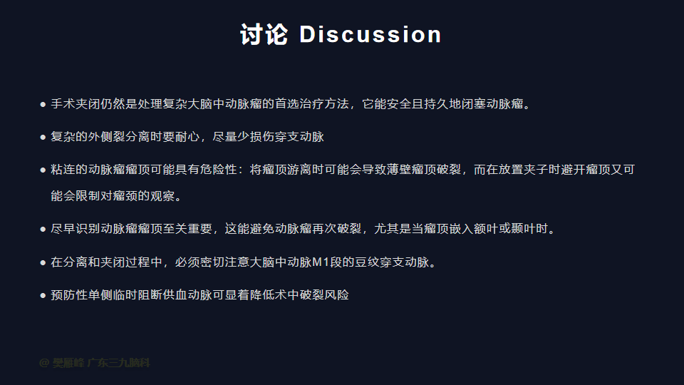 我们介绍一名69岁男性病例,他因反复头晕2个月发现的一个大型、宽颈、未破裂的MCA复杂性动脉瘤。由于动脉瘤的形态、位置和破裂风险,选择了显微外科夹闭。进行了右侧翼点入路,患者外侧裂较难分离。手术视频重点介绍了关键步骤,如分离复杂外侧裂、去除额叶粘连、实现近端和远端控制,以及在临时阻断下夹闭。夹闭后血管造影确认分岔重建良好,动脉瘤完全消失,MCA循环得以保留。术后患者神经功能完好,于术后第 10天出院。本病例强调了针对复杂MCA动脉瘤量身选择适当的动脉瘤夹重建的重要性,采用精细的侧裂分离技术和细致的动脉瘤颈剥离技术。显微外科夹闭仍是处理大型复杂MCA动脉瘤的首选方法,尽管存在固有风险,但具有高闭塞率和实用性。