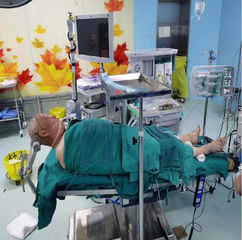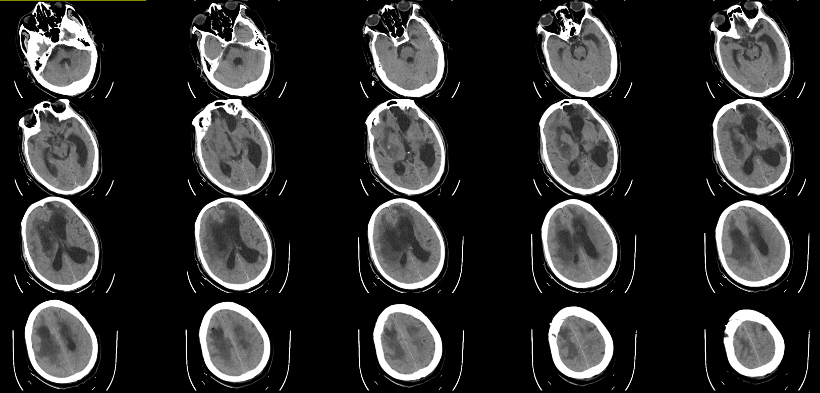 患者M,60Y,突发意识不清2小时入院。高血压病7年,心脏支架术后3年,口服阿司匹林,氯吡格雷。颅脑CT提示右侧基底节区出血并破入脑室,查体:深昏迷,气管插管,双侧瞳孔等大,左:右=3:3mm,光反应消失,GCS评分5分。 术前CT 术中体位,头高脚底位。 右额直切口,中线旁开3cm 术中所见结构 你的浏览器不支持video标签. 手术视频 术后24小时CT 术后两周CT,未见脑积水,睁眼昏迷状态,转下级医院进一步康复治疗!