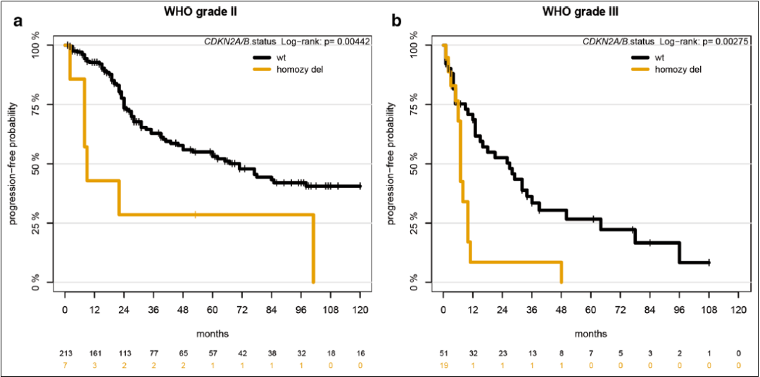 为了进一步的证明CDKN2A/2B缺失分子特征可作为脑膜瘤复发的分子标志物,研究人员扩大了临床研究人群。从528例脑膜瘤人群中鉴定到26例(4.9%)携带有CDKN2A/2B缺失。携带CNDK2A/2B缺失的脑膜瘤人群中,有7例(27%)患者的组织学分级是WHOII级的肿瘤,19例患者(79%)的组织学分级是WHOIII级。通过统计,该研究发现携带有CDKN2A/B纯合缺失的脑膜瘤患者从手术开始就具有明显更差的预后和更快的疾病进展4。因此,CDKN2A/B的缺失状态可作为鉴定高复发风险脑膜瘤患者的分子标志物。