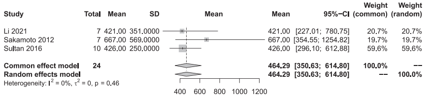 有三项研究报告了术中失血量,共有94例。HB切除过程中术中出血量估计为464.29ml(95%CI:350.63ml至614.80ml)(图5)。