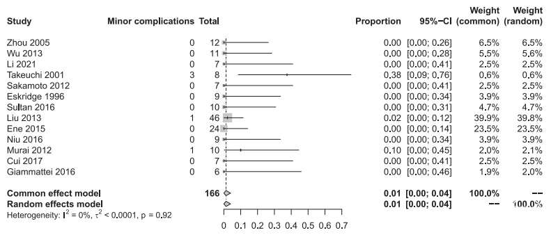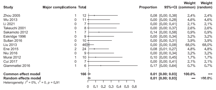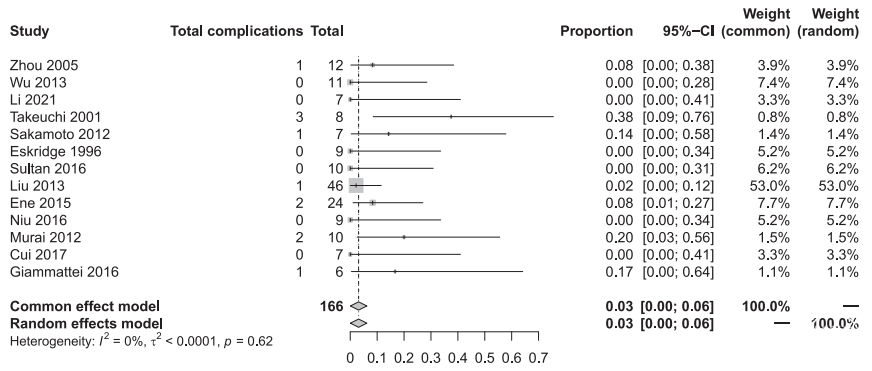 小脑缺血、缺血性卒中、瘤内出血、蛛网膜下腔出血、后颅窝水肿伴脑积水和丘脑梗死被认为是主要并发症。有五项研究报道了这些主要并发症,共有6例。主要并发症发生率为1%(95%CI:0%~3%)(图3)。