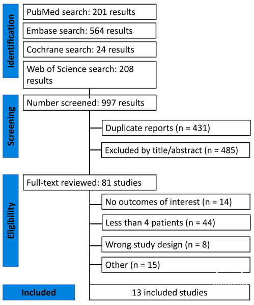 最终纳入13项研究,包括166例接受HB切除术前栓塞的患者,研究的选择流程如图1所示。