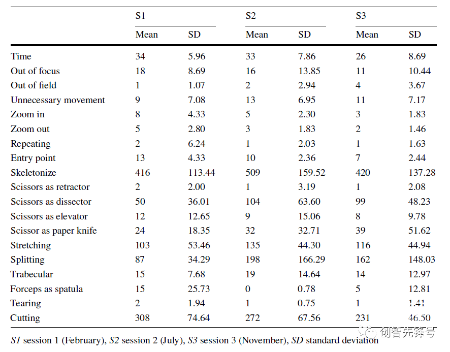 每一段解剖都被记录在视频中,并由两名独立的评估者分析。我们测量了完成任务所需的时间,以及几个指标,以评估解剖和操作外视镜系统的手工技能(表1)。