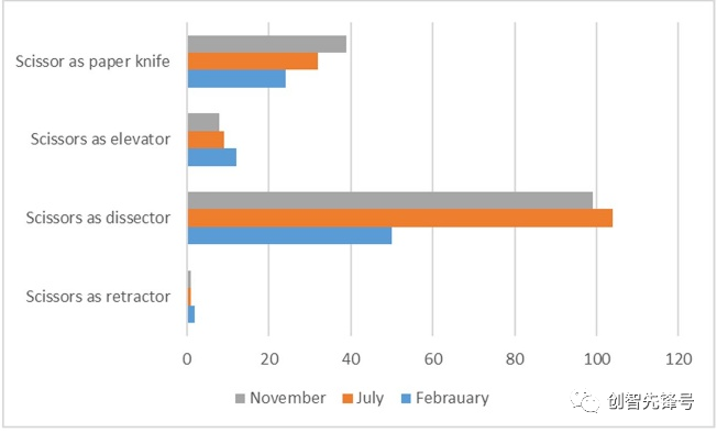 在显微手术的动作中,我们看到了几个有趣的模式(图5)。随着参与者学会如何更快速地直接到达目标,重复动作的数量和寻找夹层进入区域的尝试随着经验的增加而减少。随着技术水平和信心的提高,解剖策略向更高效的方法转变,钝性分离被锐性分离取代。这也反映了器械使用的多功能性。在试验结束时,显微剪刀被更积极地用于多项任务,较少用于简单的切割,但较多用于分割、分离和提拉。最大变化是增加如裁纸刀式操作显微剪刀的次数,这意味着更少的实际切割操作、小梁组织的处理操作和使用镊子作提拉操作。这些变化主要是由于显微技能的提高、对器械能力更多的信任以及对实时复杂动作更大的信心。
