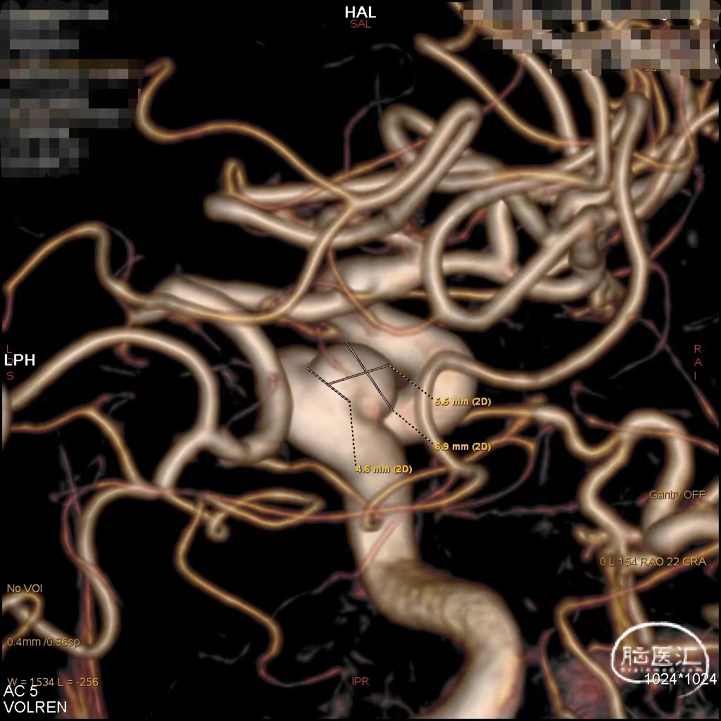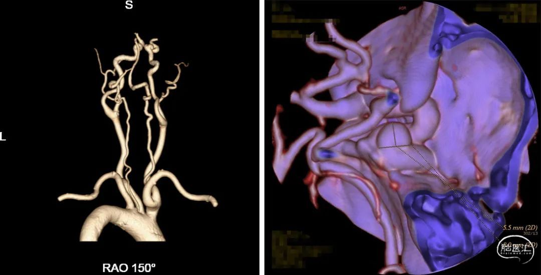 入院前CTA影像检查:CTA影像提示右侧颈内动脉C4段瘤样突起,考虑动脉瘤。