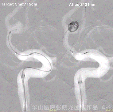 图 4 GIF. SL-10微导管头段塑C弯后置于动脉瘤腔内。经微导管填入Target 3D 5mm*15cm弹簧圈,Atlas 3*21mm支架从左侧A2向A1释放,随后继续填入3枚弹簧圈(target 3D 4mm*15cm, 4mm*10cm, 4mm*8cm)。复查造影动脉瘤栓塞满意,前交通动脉通畅。经导引导管内静注替罗非班10ml和尼莫地平1ml。