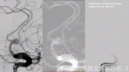 Figure 3 GIF. General heparinization was performed. An size 4.5*4.3mm, neck 2.9mm, proximal parent artery 2.9mm, distal parent artery 2.0mm. 6F Envoy DA was placed into left ICA cavernous segment. Nimodipine 1ml was administered. First advanced a C-tipped Freepass-21 into left A2, then SL-10 into right A2. Tried to exchanged SL-10 to another Freepass-21, Rebar-18 and Prowler plus, all failed. Withdrew the Freepass-21 of left A2 segment. A Frepass-21 was place at the right A2 segment, then navigated a SL-10 into the left A2 via a V-18 for support. A Solitaire 4*20mm was deployed from right A2 to left A1.