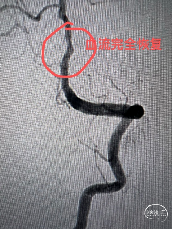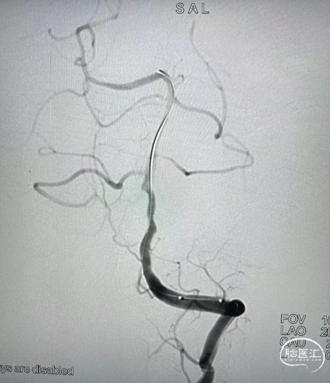 释放支架后左侧椎动脉正位造影,狭窄明显改善,支架释放后远端血流无影响。