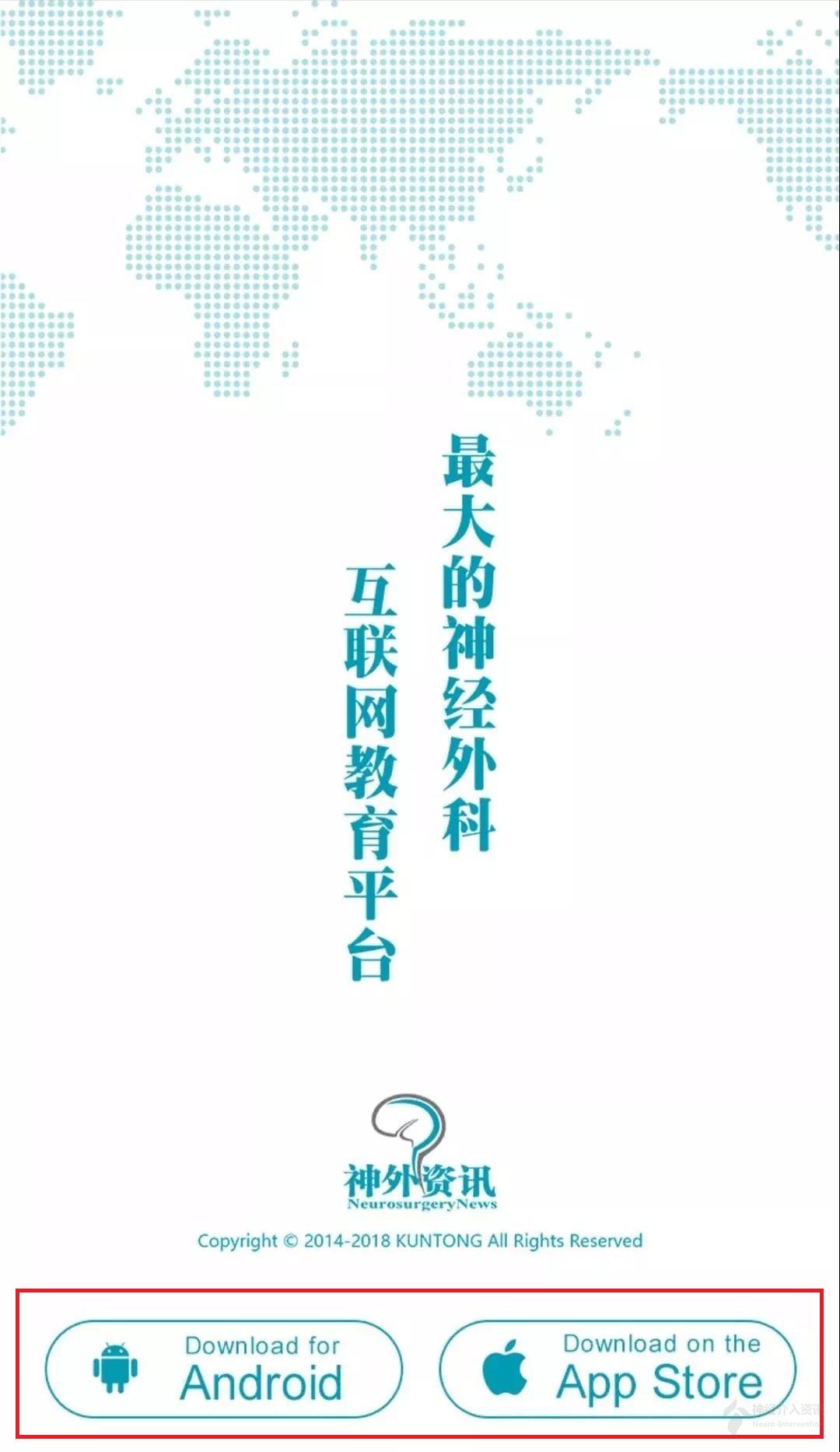"神外资讯"APP下载途径,扫描下方二维码,出现下载页面,点击红框标记处可下载(苹果手机可以通过应用商店查找关键词”神外资讯“直接下载):