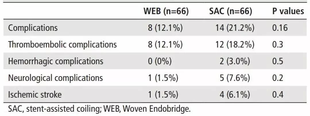 表1. WEB与常规支架辅助弹簧圈治疗并发症比较