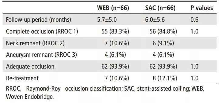 临床随访中,两组患者预后良好(mRS≤2)的比例相一致,均为86.4%(57/66)。而6个月影像随访结果显示,WEB组55例(83.3%)治愈,7例(10.6%)瘤颈残留,4例(6.1%)瘤体显影,7例(10.6%)接受了再治疗;支架辅助栓塞组56例(84.8%)治愈,6例(9.1%)瘤颈残留,4例(6.1%)瘤体显影,8例(12.1%)接受了再治疗。两组有效栓塞率(治愈+瘤颈残留)无明显统计学差异。