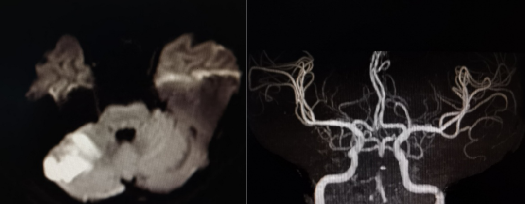 入院颅脑MRI+MRA可见右侧小脑新发梗死,基底动脉中段显影欠佳。
