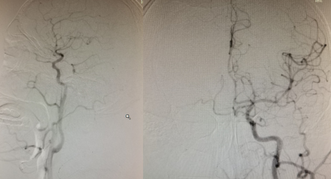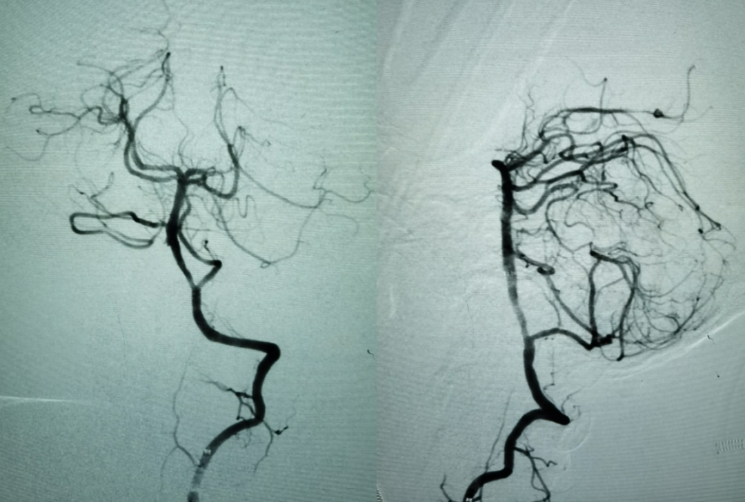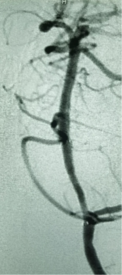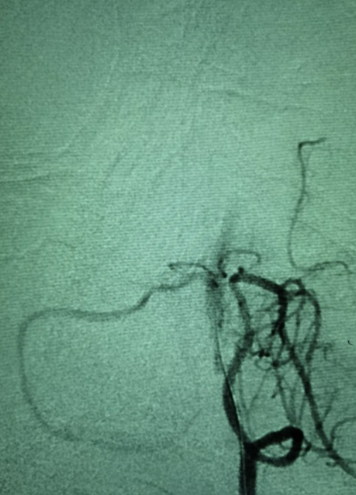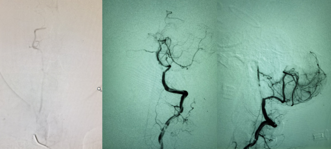 全脑血管造影提示右椎纤细,颅内段不显影。左椎颅内段发出小脑后下动脉已远闭塞,但部分血管吻合,使左椎V4远端浅淡显影。