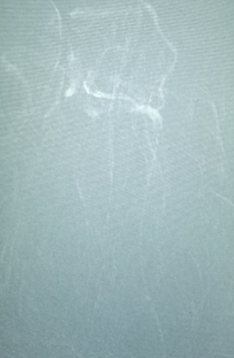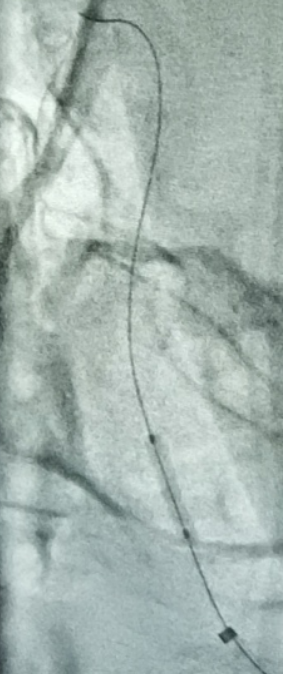 留置300cm FATHOM微导丝,撤出微导管后造影,似乎有了一点正向血流,但压力不够,被逆向血流冲淡。