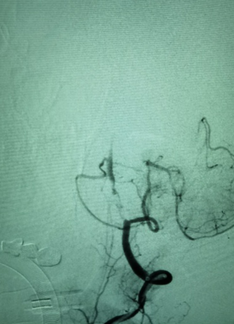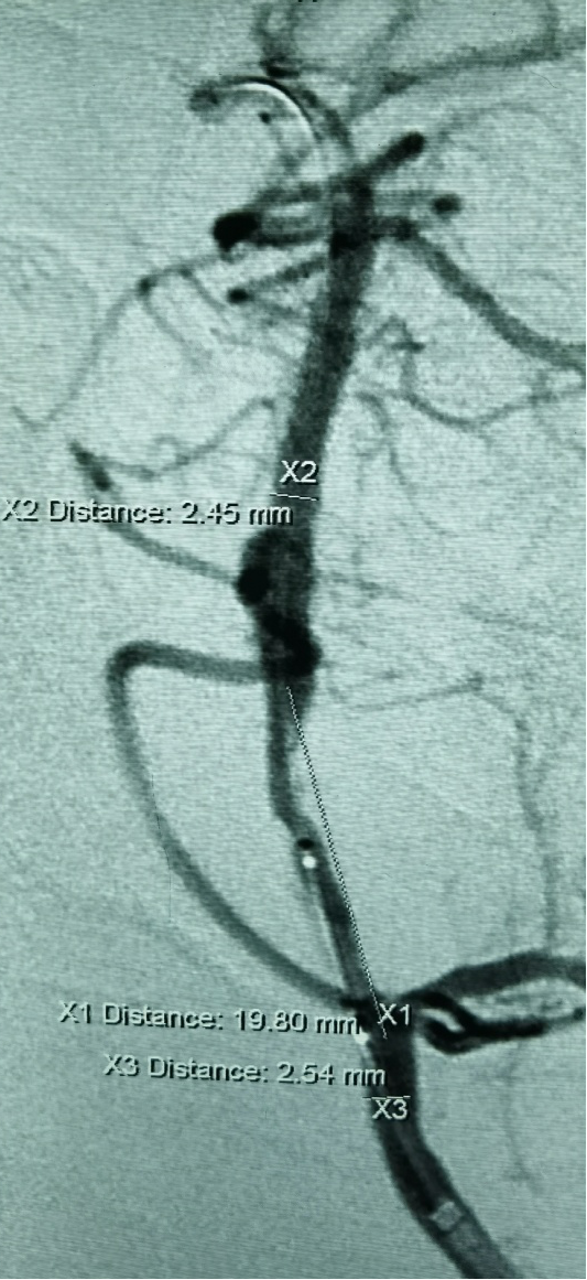 扩张后造影,提示恢复正向血流,残余狭窄50%左右。