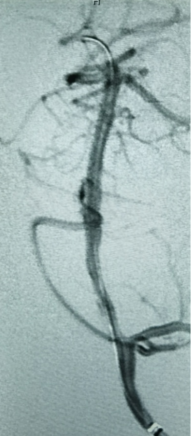 5F 115cm远端通路导管超选至左侧椎动脉V3段,选取术中工作角度造影。