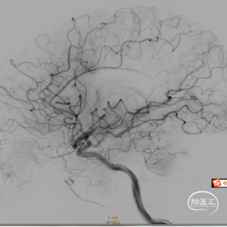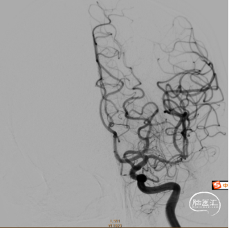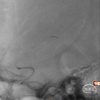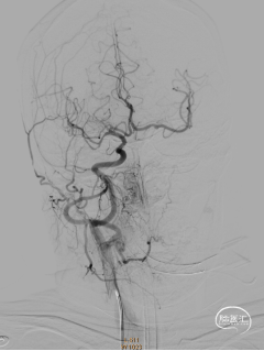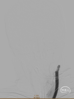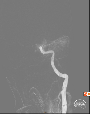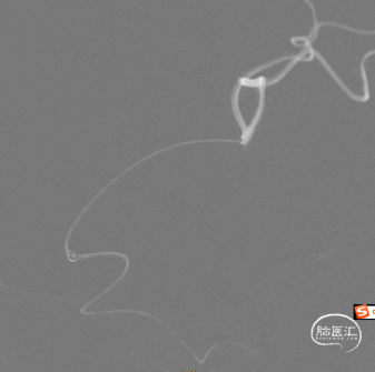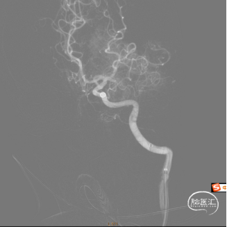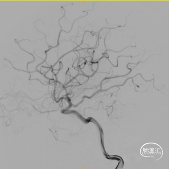 再次应用6F抽吸导管抽吸,仍有少量暗红色血栓抽出,造影可见左侧大脑前动脉及左侧大脑中动脉。大脑动脉M1远段未见显影(血栓逃逸)。