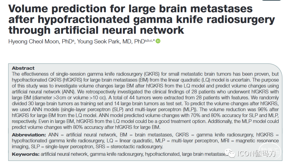 《Medicine (Baltimore)》2022 年10月7日在线发表韩国Chungbuk National University Hospital的Hyeong Cheol Moon , Young Seok Park 撰写的《利用人工神经网络预测大分割伽玛刀放射外科治疗后的脑转移瘤体积 。Volume prediction for large brain metastases after hypofractionated gamma knife radiosurgery through artificial neural network》(doi: 10.1097/MD.0000000000030964.)。
