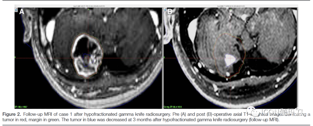 脑转移瘤(BM)通常被认为是并发系统性癌症的颅内肿瘤,是患者发病和死亡的关键原因。BM的发病率增加的原因,可能是由于通过手术、放疗、放射外科和全身化疗等方法更好地控制了局部肿瘤,从而延长了生存期。最近,立体定向放射外科(SRS),如伽玛刀放射外科(GKRS)作为转移性脑肿瘤的治疗越来越受到欢迎。然而,在一些研究中已有报道,由于相对于单次疗程SRS的辐射毒性,SRS治疗大的病灶(直径>3 cm)仍然难以控制。以往的报道很少证实用GKRS治疗大型BM。