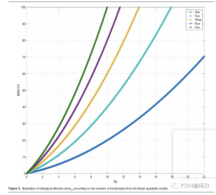 在规划GKRS时,肿瘤边缘比现有肿瘤切缘大0.5 mm,如图2所示。我们使用MATLAB (R2018a版本,MathWorks, USA)从LQ模型简单计算处方剂量(50%边缘)。几乎所有BM均遵循α/β = 10。根据LQ模型方程(BED = nD [1 + [D/ (α/β]]),根据图3中分割次数选择处方剂量。