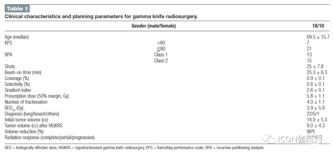 28例因大型BM接受hfGKRS的患者的特征列于表1。每3个月随访一次,观察肿瘤复发或新发肿瘤。初始肿瘤体积为14.0±5.3 cc, hfGKRS治疗后肿瘤体积为9.0±4.3 cc。除2例外,大的肿瘤均有放射影像学反应。
