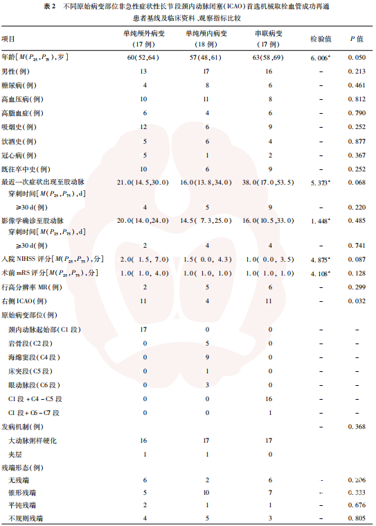 单纯颅内病变患者的原始病变部位主要位于C2、C4、C5、C6段,分别占5/18、9/18、1/18、3/18。串联病变患者原始病变部位位于C1段+C4~C5段和C1+C6~C7段,分别占16/17和1/17,单纯颅外病变患者的原始病变部位均位于C1段(17/17)。不同原始病变部位的血管成功再通患者中,单纯颅内病变患者年龄更小(P=0.050)、右侧ICAO比例更低(P=0.032),串联病变患者置入支架数量更多(P=0.013)。单纯颅外病变、单纯颅内病变及串联病变患者取出栓子的患者比例分别为17/17、17/18、12/17,差异有统计学意义(P=0.024)。不同原始病变部位的患者既往史、残端形态、颈内动脉远端反流、手术方式、手术时长、全身麻醉、观察指标等方面差异均无统计学意义(均P>0.05)。见表2。