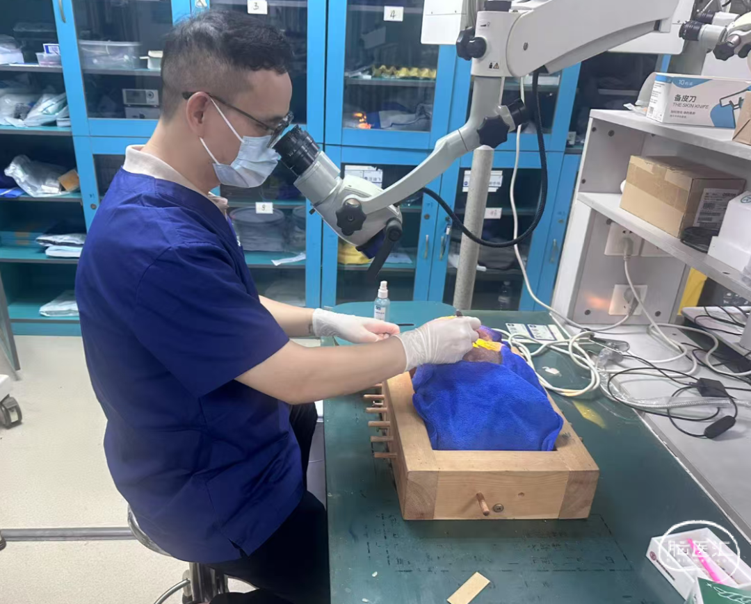 初到解剖班时,虽然平时工作中积累了一定的神经外科基础,但真正坐在显微镜前,手持显微镊和剪刀时,手指仍会不自觉地颤抖。记得第一次训练缝合手套时,针线在镜下显得无比粗大,缝合时不是打结过松就是撕裂手套皮,反复失败让我倍感挫败。但是我一直铭记自己前来学习的目的,于是,我计划分配一定的训练时间,从最基础的持针、打结练起。一段时间后,当我能流畅完成10-0缝线的血管吻合,那种成就感至今难忘。