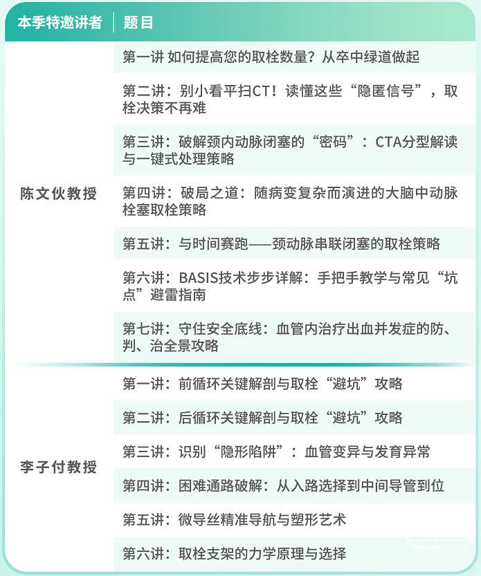 陈文伙教授(7讲)聚焦临床决策与高难策略,从优化卒中绿道、提升取栓量的宏观布局,到攻克串联闭塞、大脑中动脉栓塞等复杂病例的实战策略,形成从接诊到决策的完整思维链。