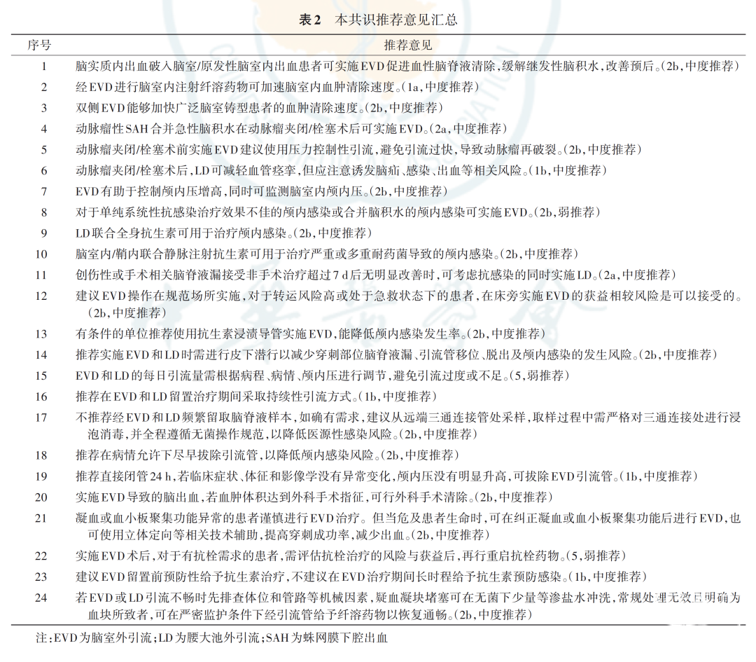 ● 推荐意见1:脑实质内出血破入脑室/原发性脑室内出血患者可实施EVD促进血性脑脊液清除,缓解继发性脑积水,改善预后。(2b,中度推荐)