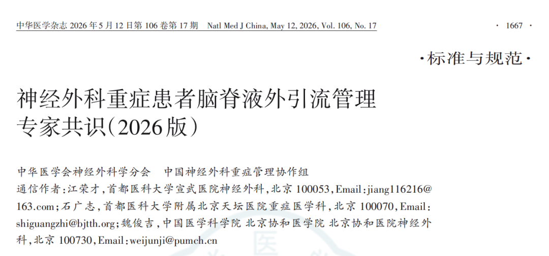 脑脊液外引流的围手术期管理必须引起重视,包括引流管的选择、引流量的管理、引流管的拔除以及并发症的处理。中华医学会神经外科学分会、中国神经外科重症管理协作组组织神经外科重症领域专家应用循证医学证据结合专家意见的方法,在《神经外科脑脊液外引流中国专家共识(2018版)》的基础上进行修订更新,制订了《神经外科重症患者脑脊液外引流管理专家共识(2026版)》,旨在规范神经外科重症患者脑脊液外引流的临床应用与管理。
