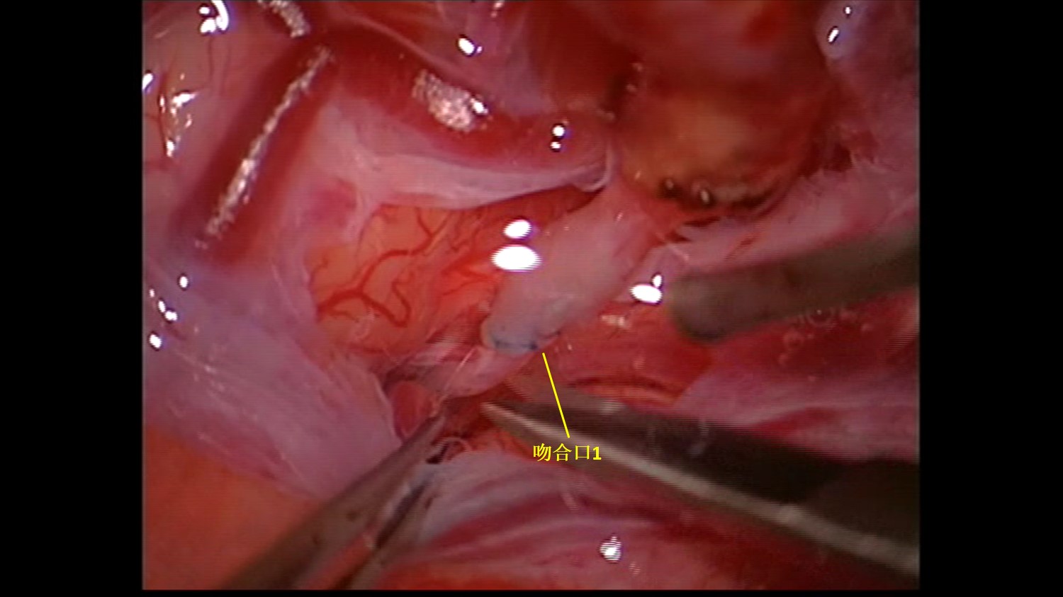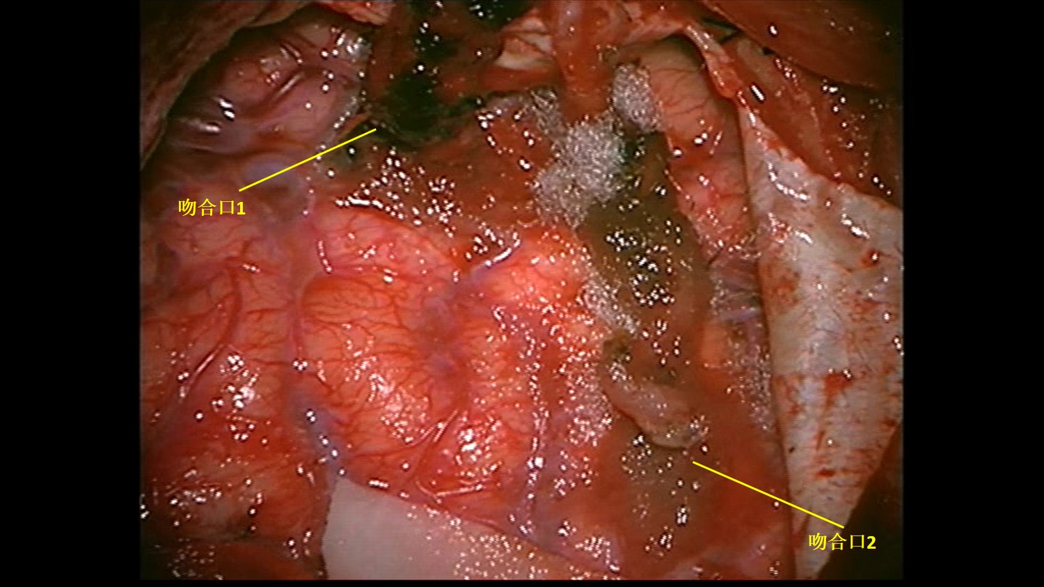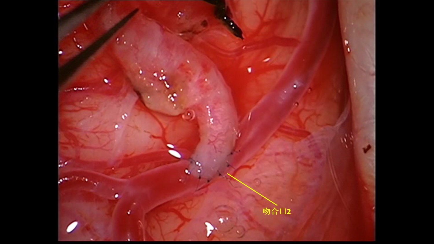 吻合口1,松开阻断夹,可见受体血管有压痕,弹起困难。受体血管可能长期血流较少,管壁增厚。