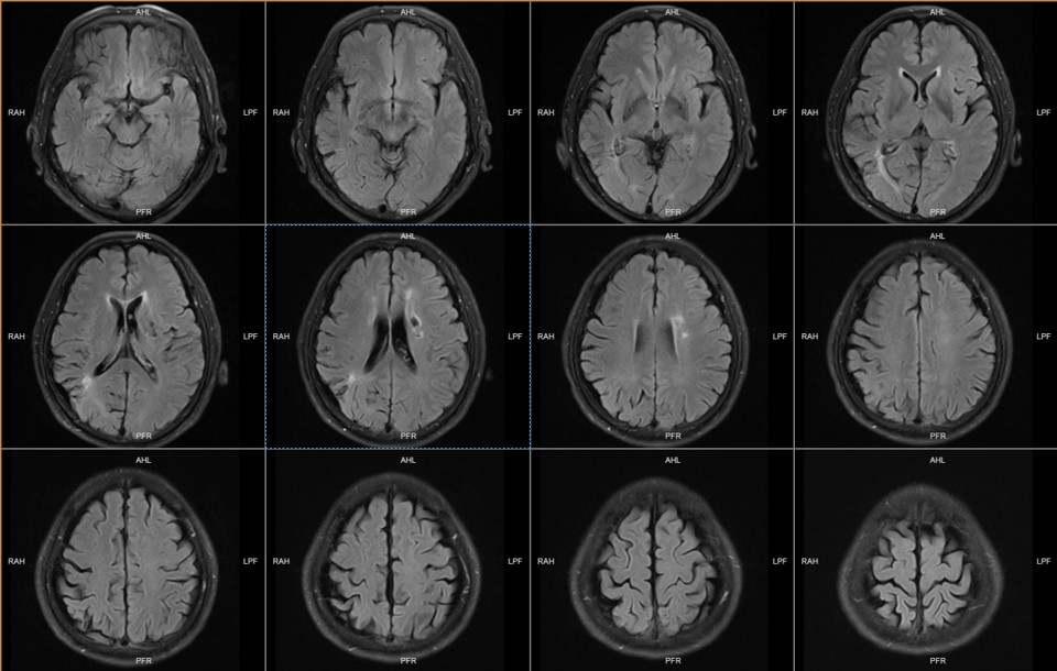 FLAIR显示左侧脑室旁陈旧性梗死灶;右侧脑室后角顶下小叶梗死灶。