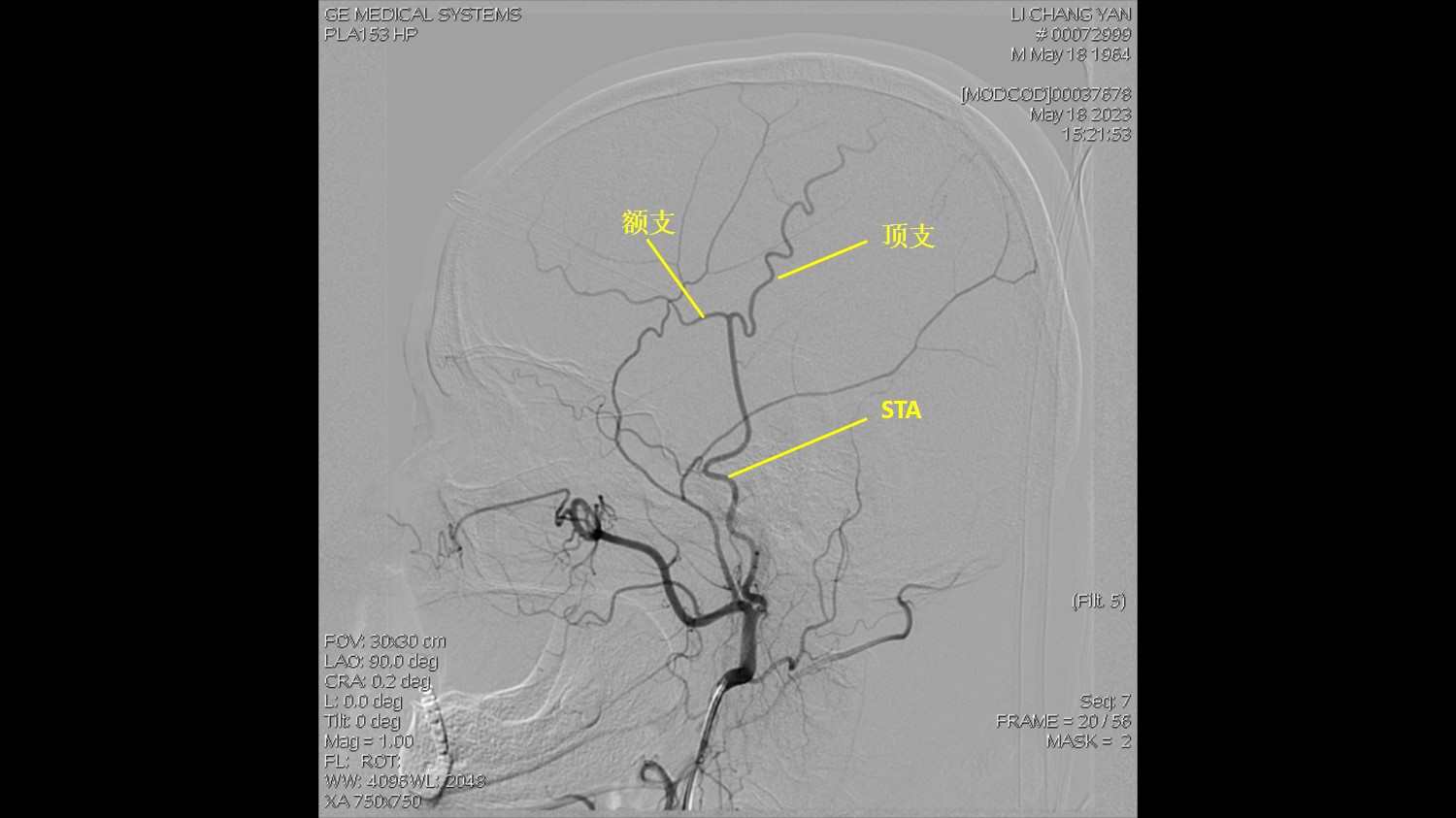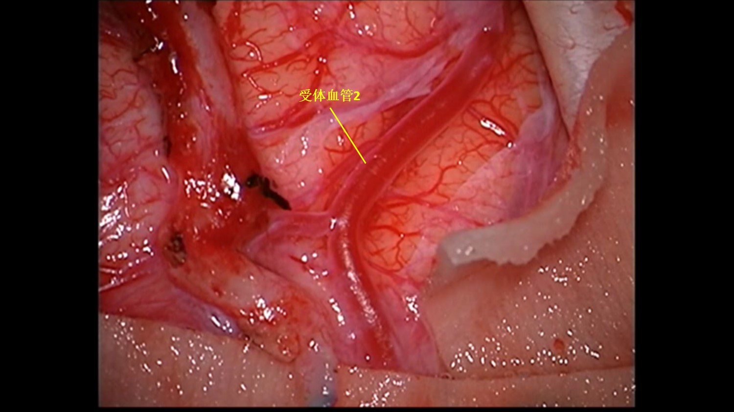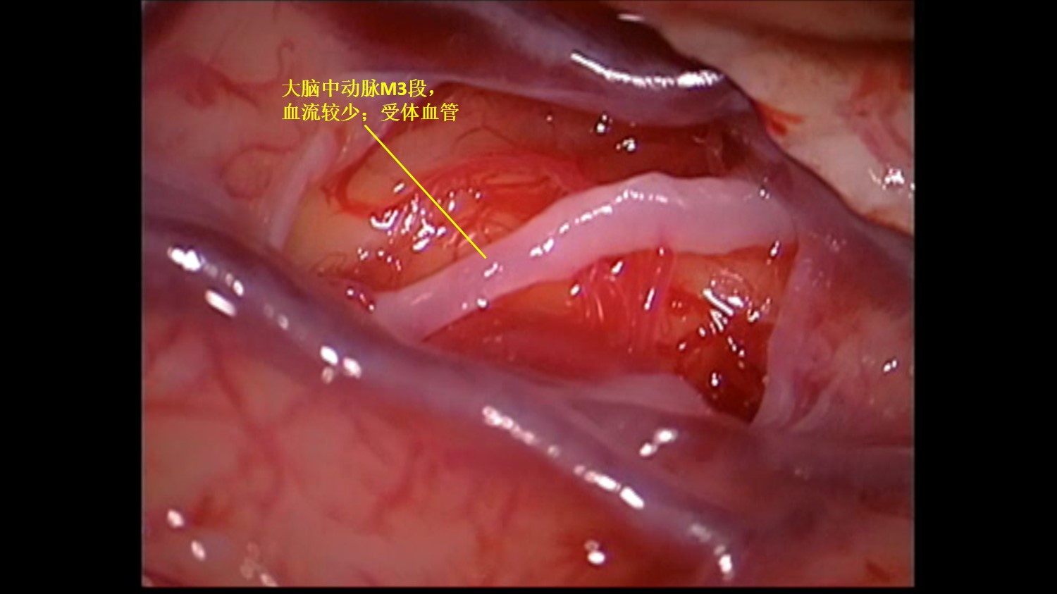受体血管1:侧裂末端MCA,血管内血流减少。徐斌教授曾讲过,受体血管网是受体选择所要考虑的重要因素,这个受体血管网可能较差。