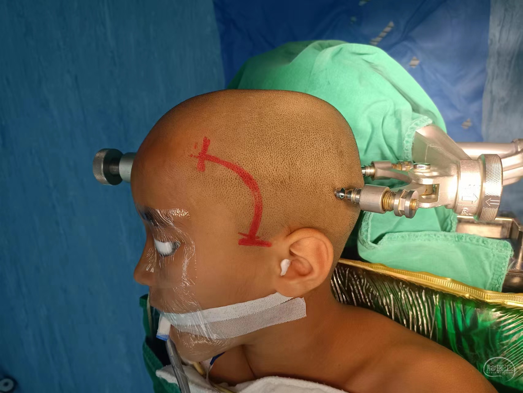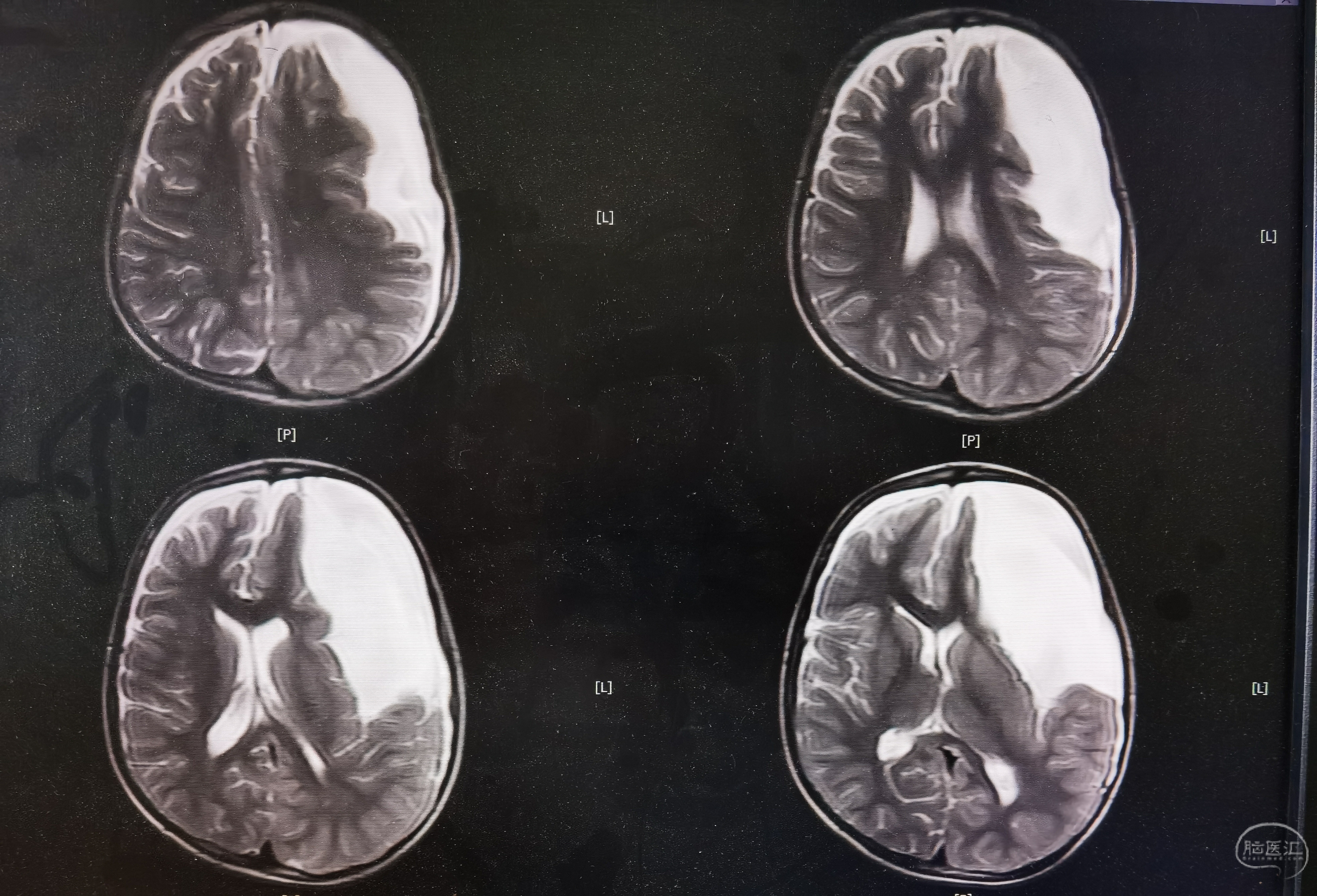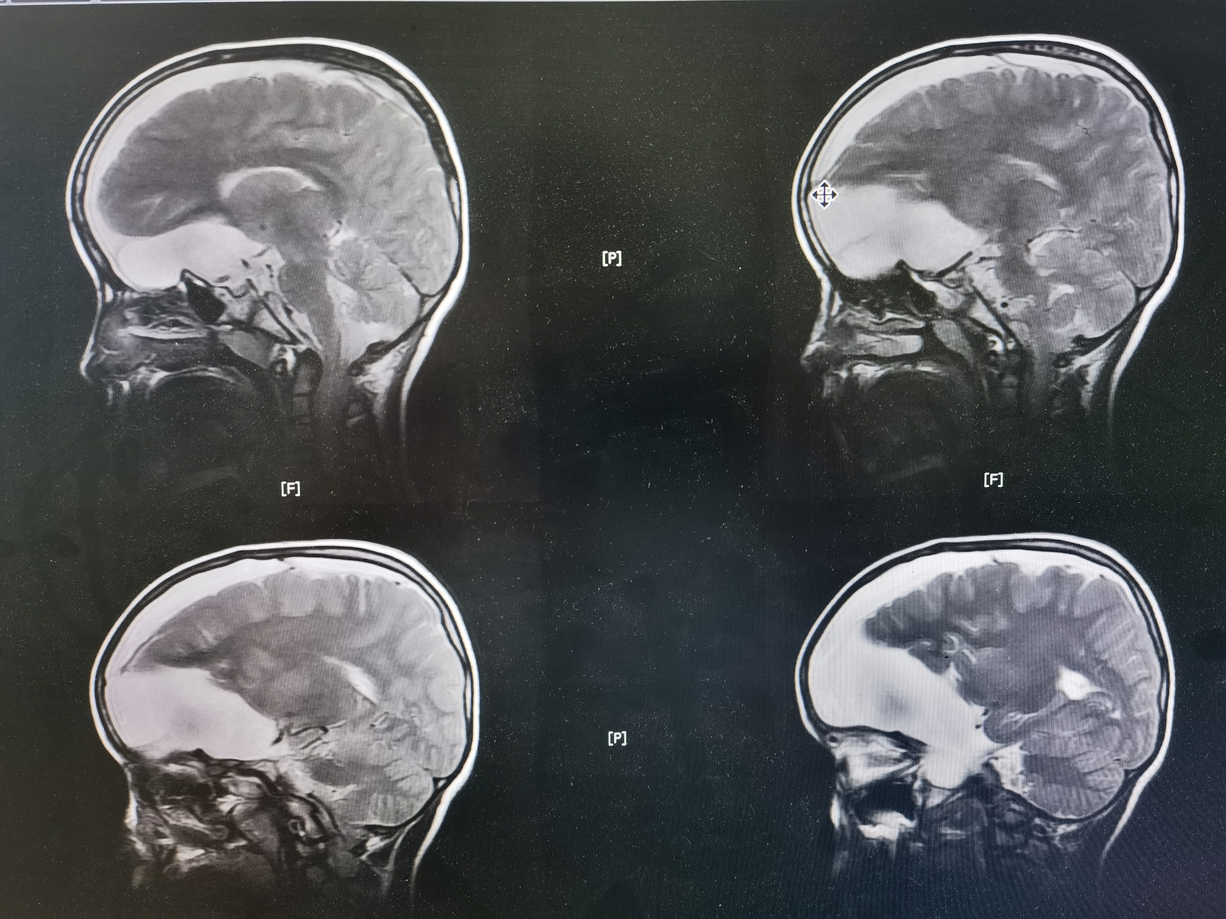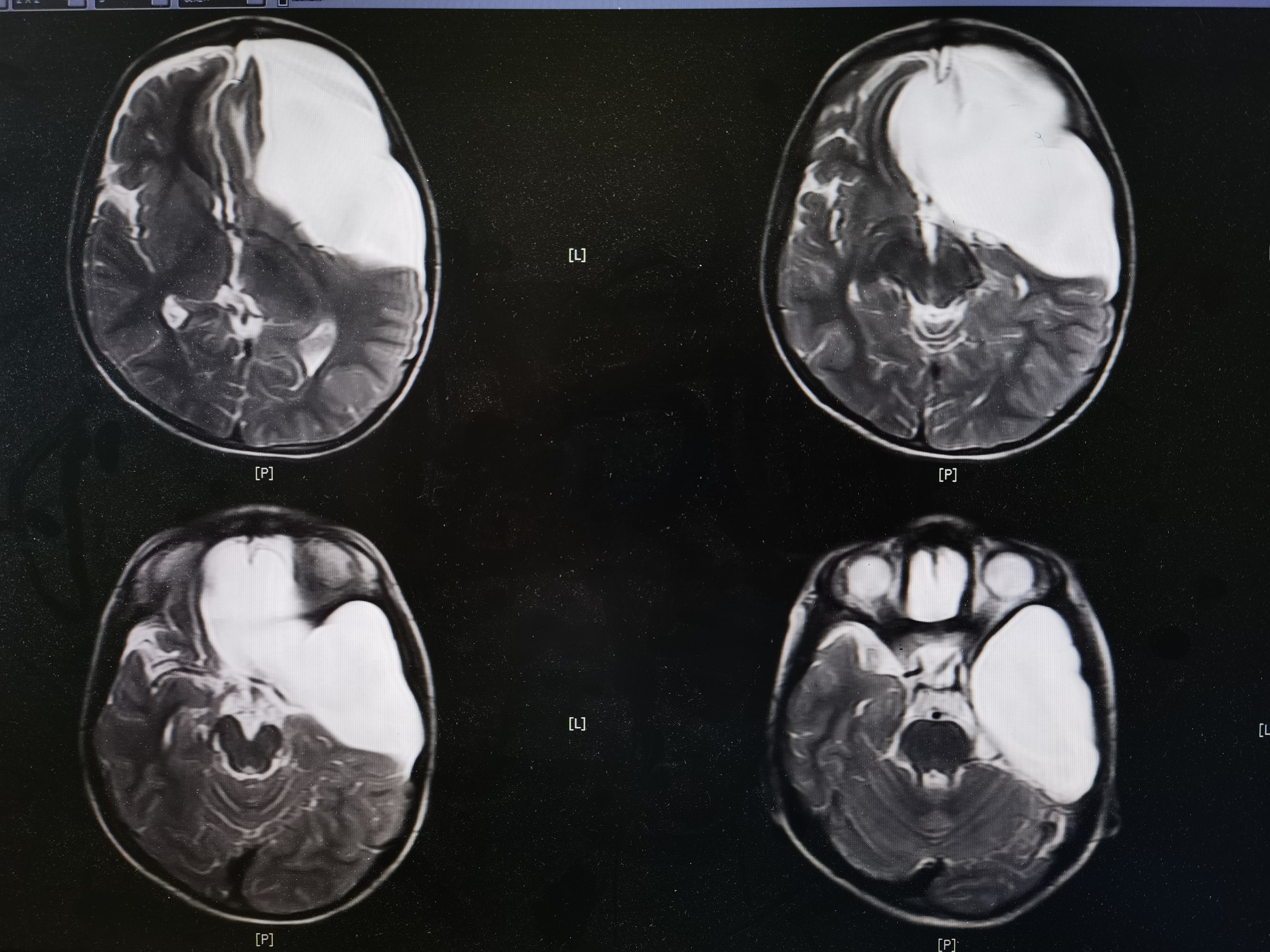 8岁男孩,以“头部外伤后头晕8天”入院,患儿8天前于3米高处坠落摔伤头部,伤后有昏迷史,当地医院CT提示左额颞巨大蛛网膜囊肿,破裂可能。患儿伤后感头晕,当地医院建议转至我院。我院完善头颅MR提示左额颞巨大蛛网膜囊肿,局部越过中线突入右侧镰旁挤压右额叶,左侧额颞岛叶明显受压,囊肿破裂可能。
