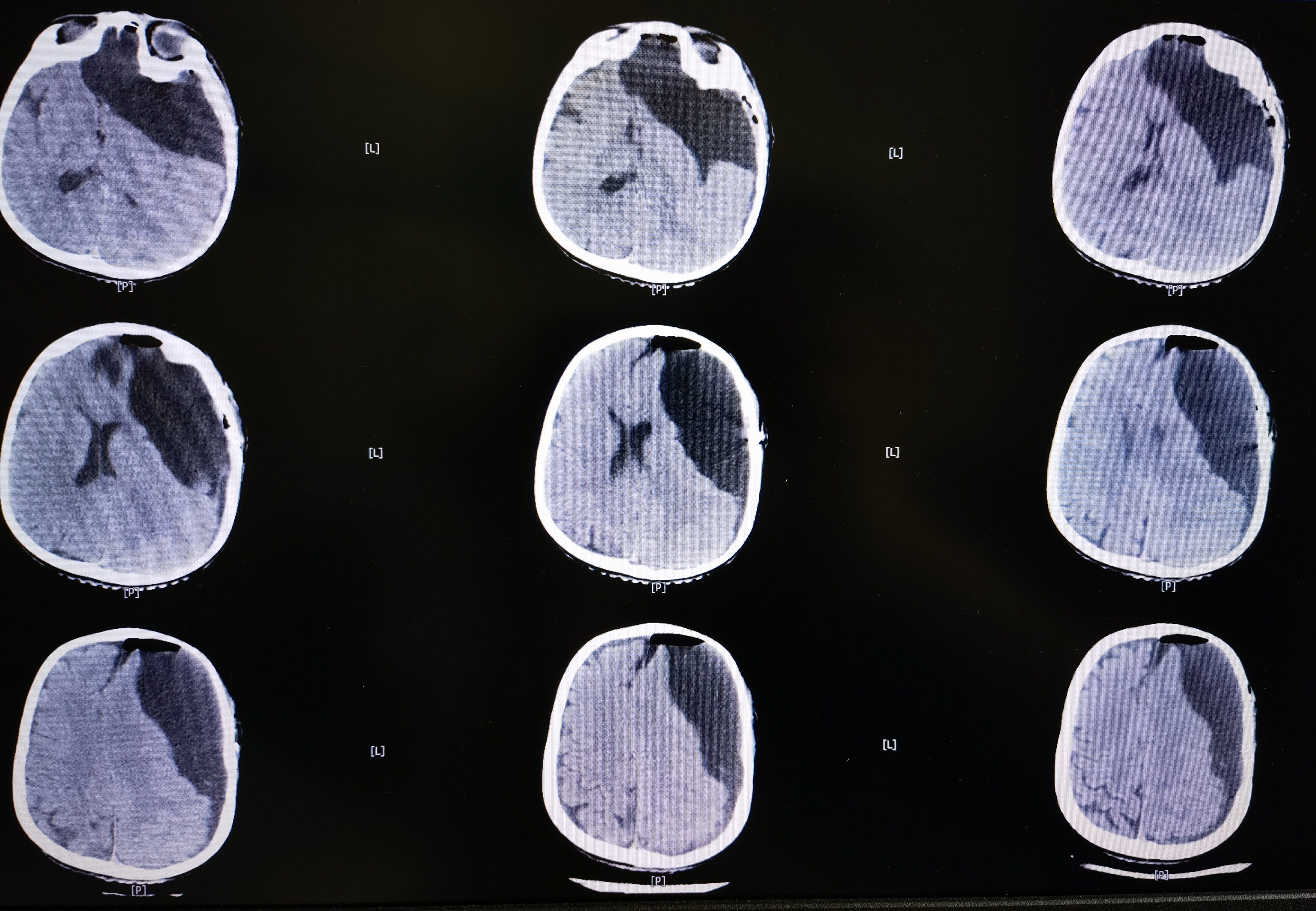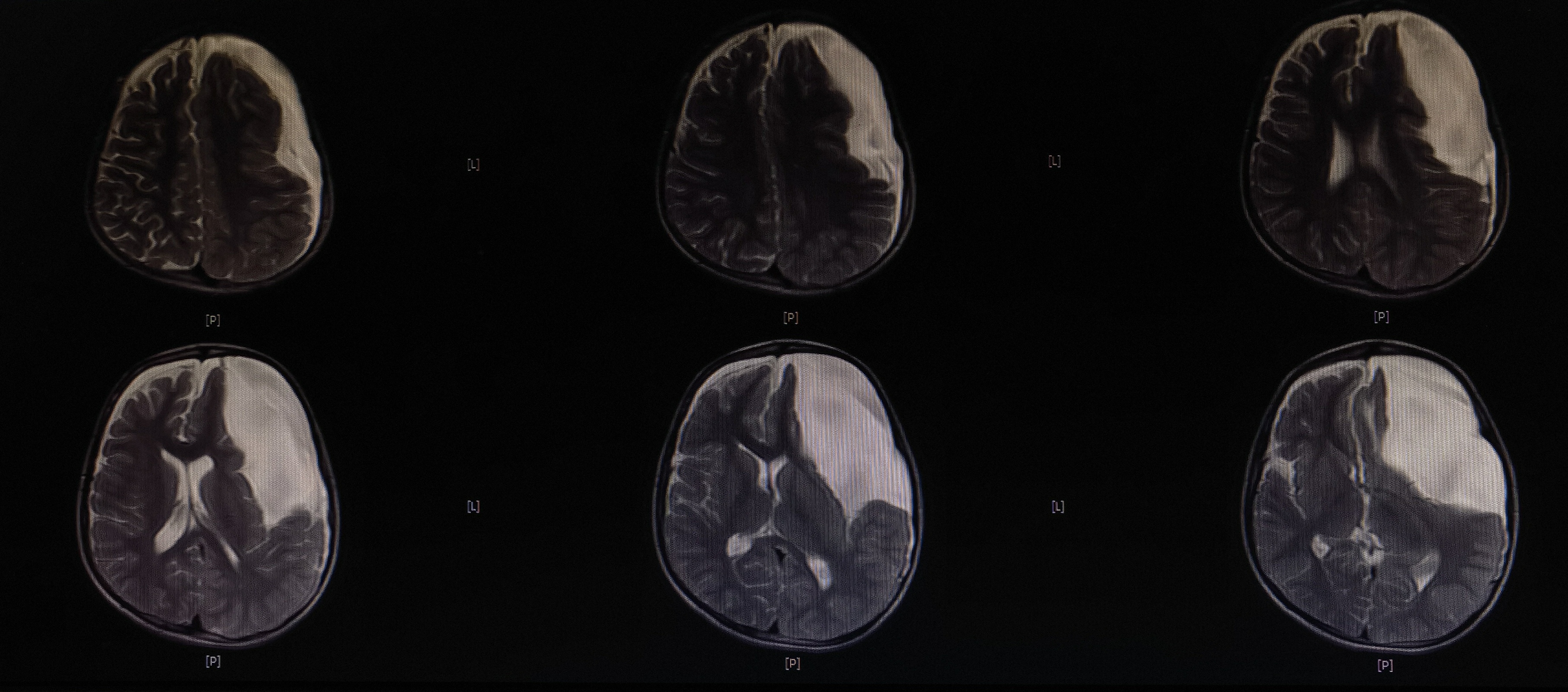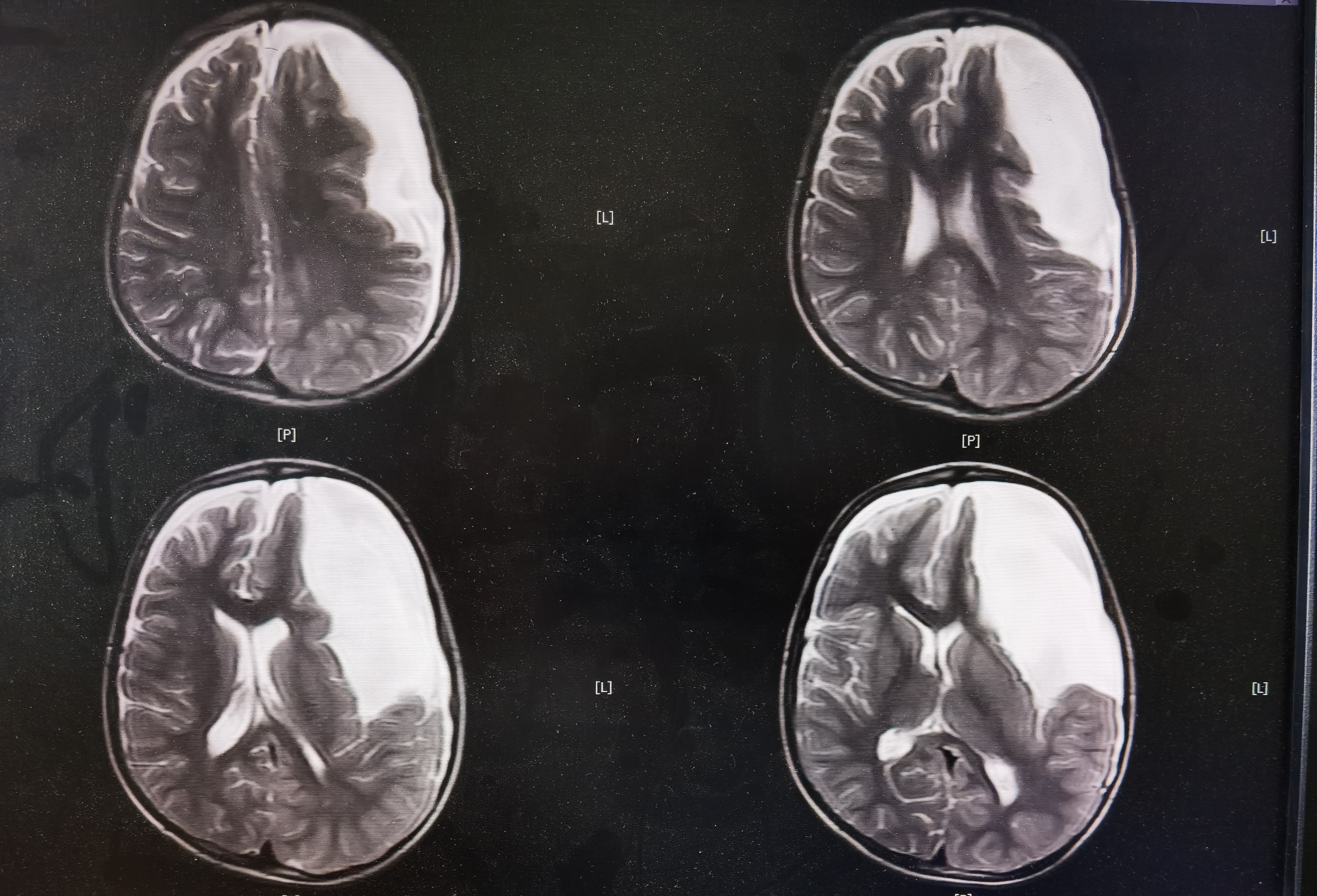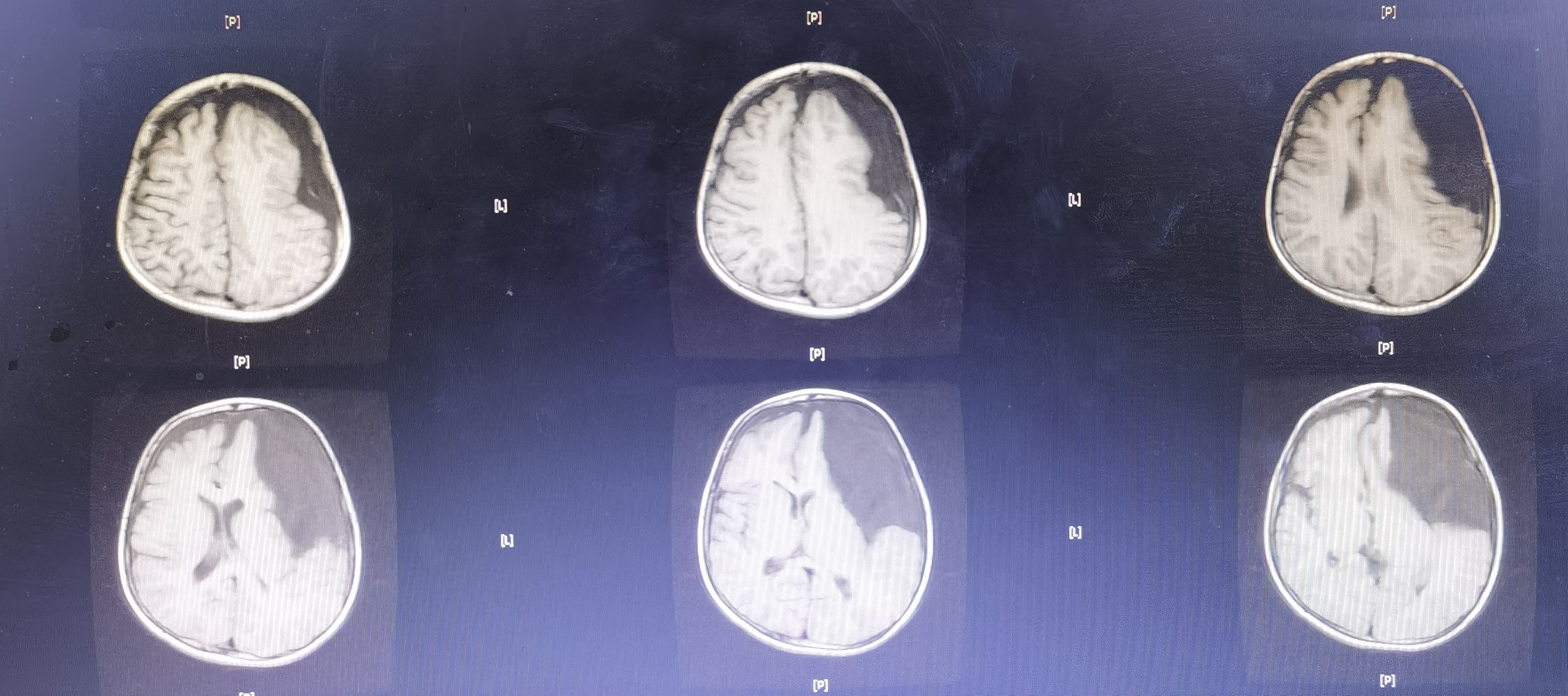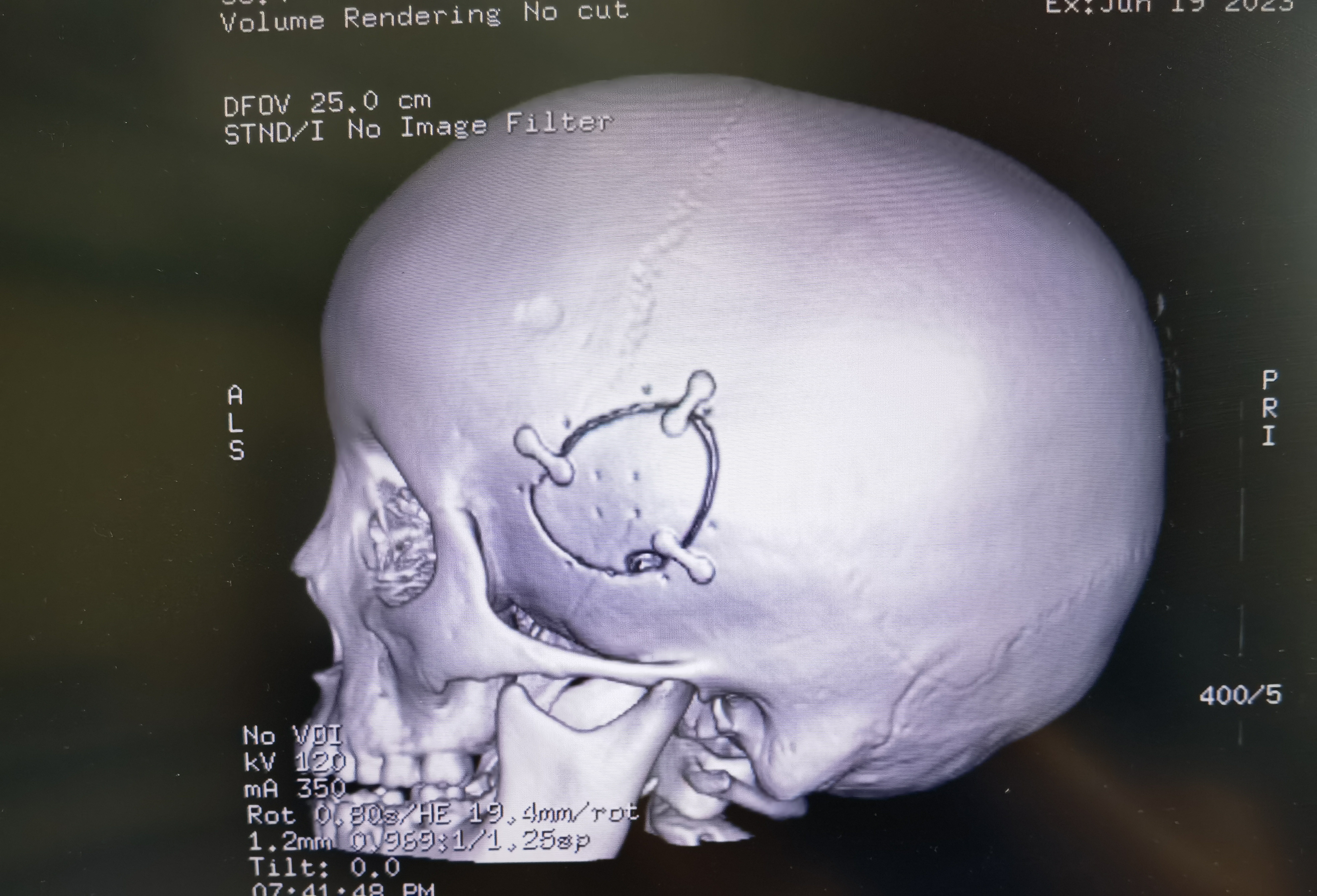 8岁男孩,以“头部外伤后头晕8天”入院,患儿8天前于3米高处坠落摔伤头部,伤后有昏迷史,当地医院CT提示左额颞巨大蛛网膜囊肿,破裂可能。患儿伤后感头晕,当地医院建议转至我院。我院完善头颅MR提示左额颞巨大蛛网膜囊肿,局部越过中线突入右侧镰旁挤压右额叶,左侧额颞岛叶明显受压,囊肿破裂可能。