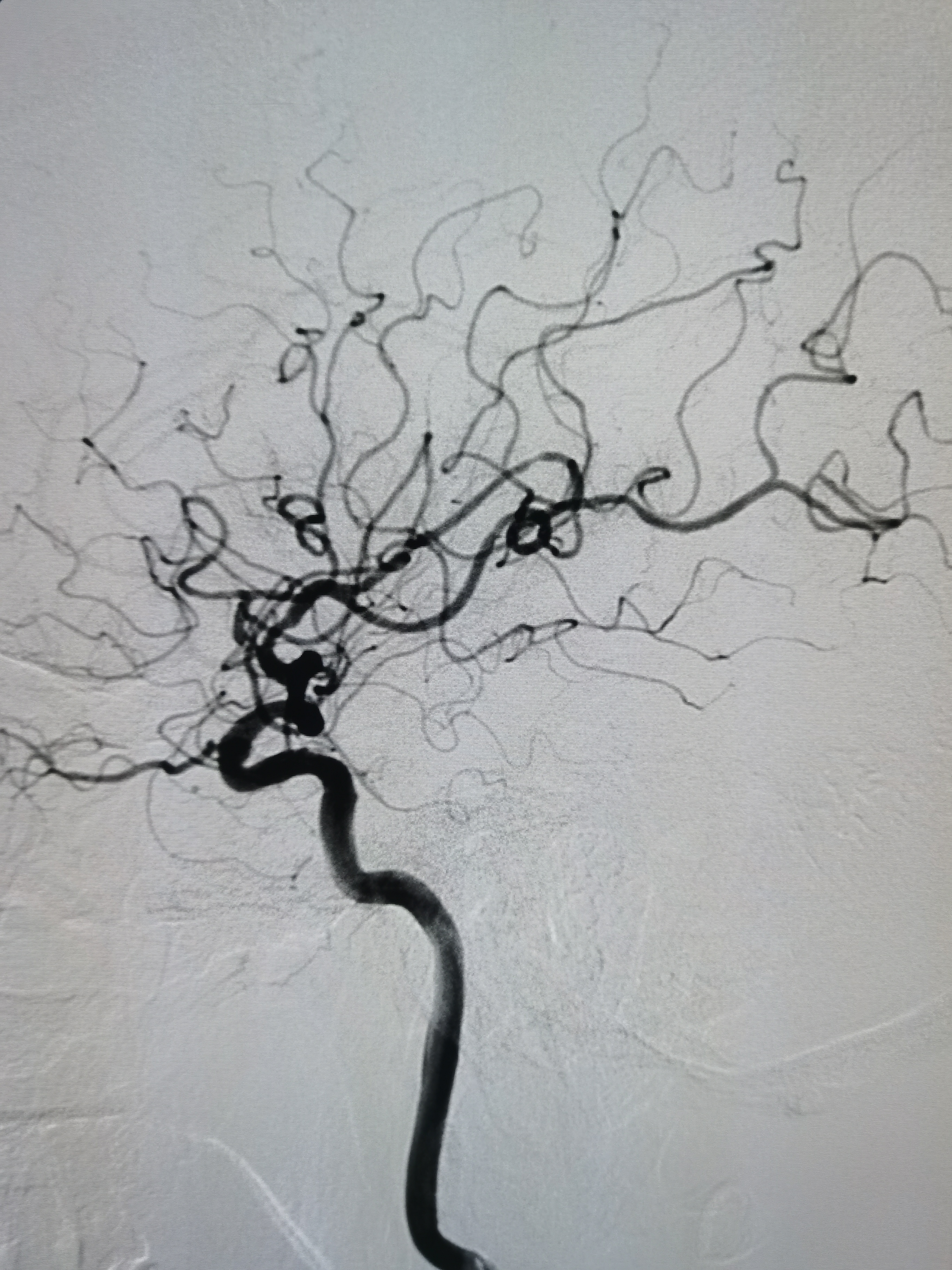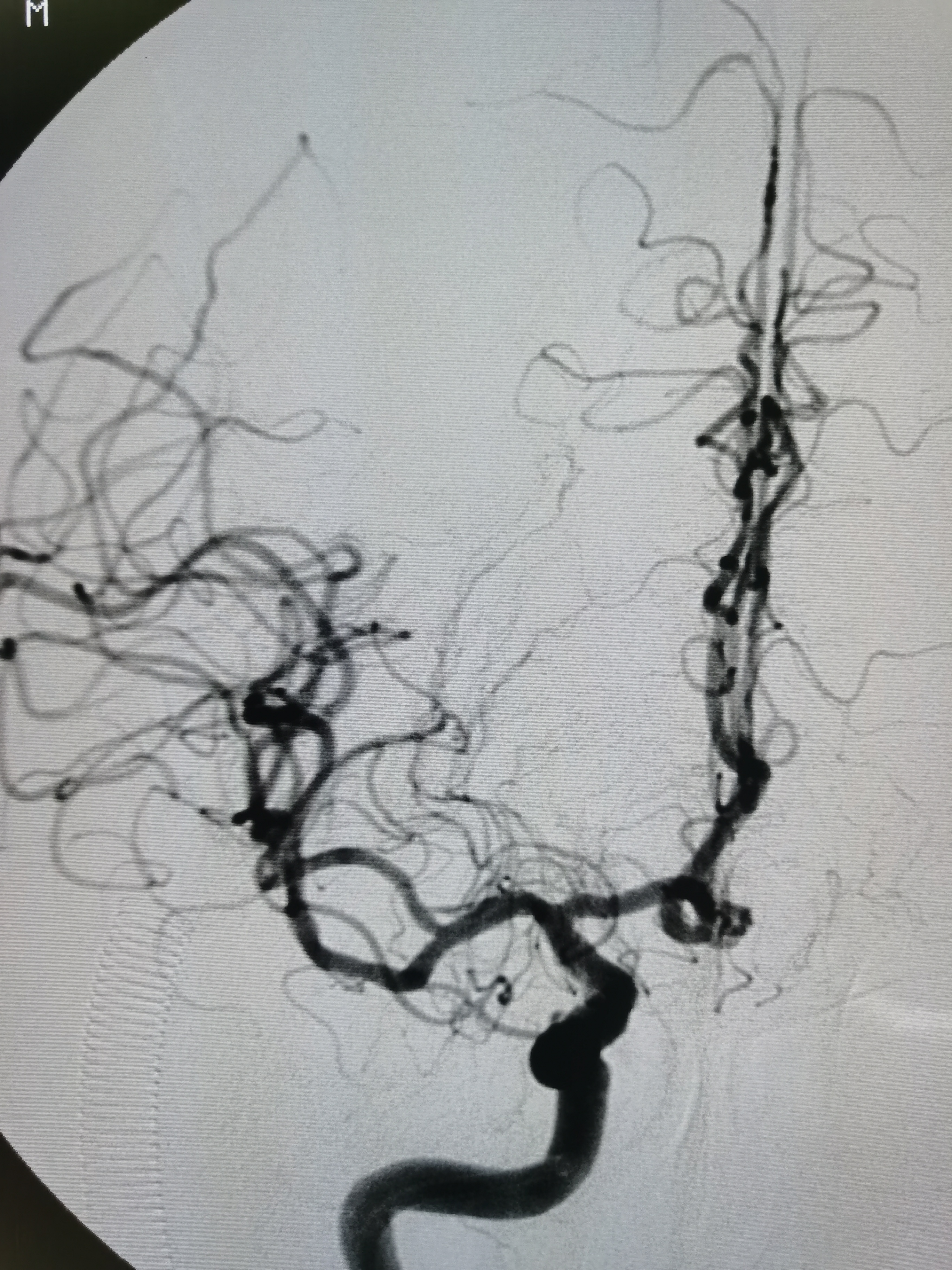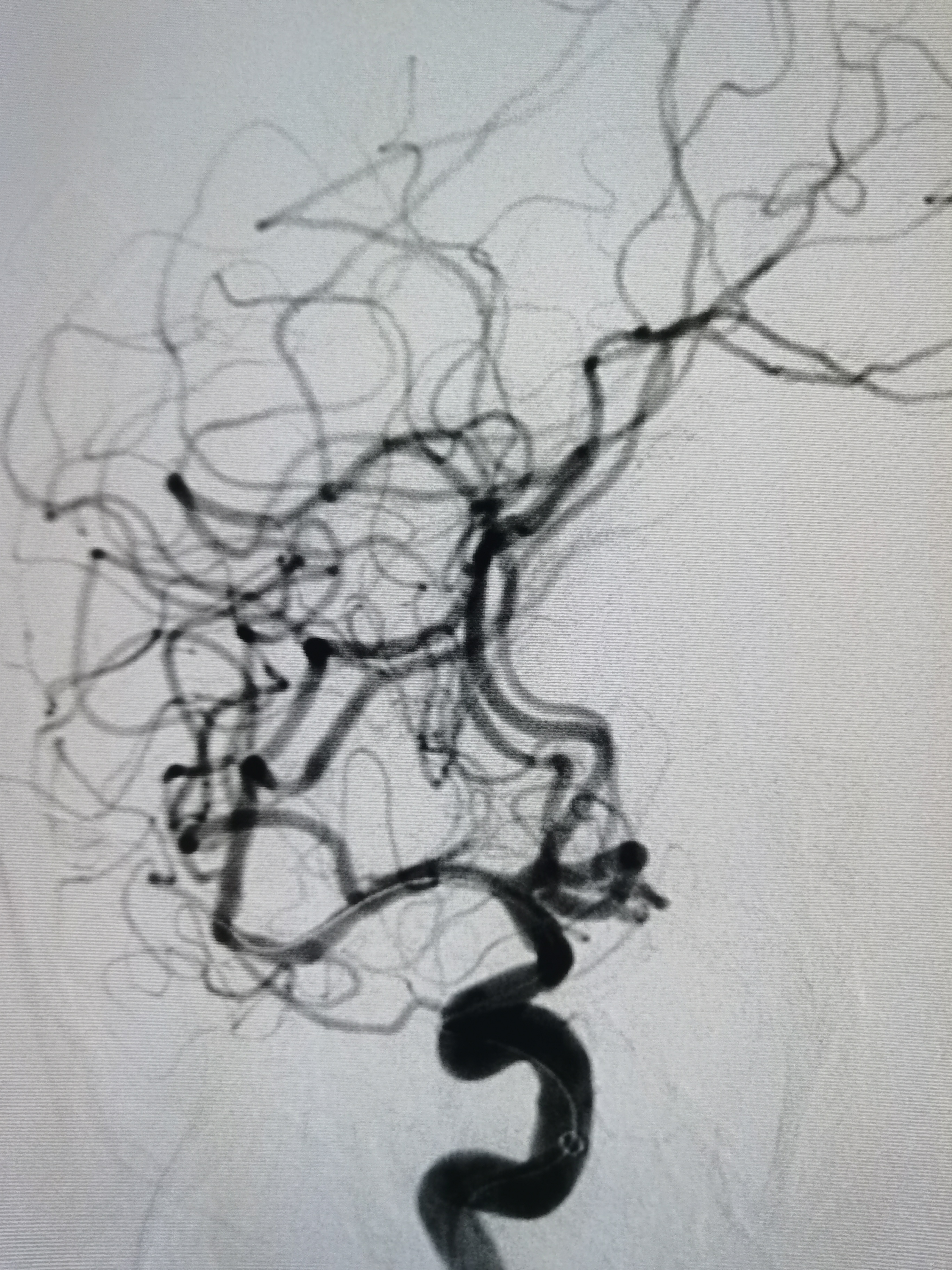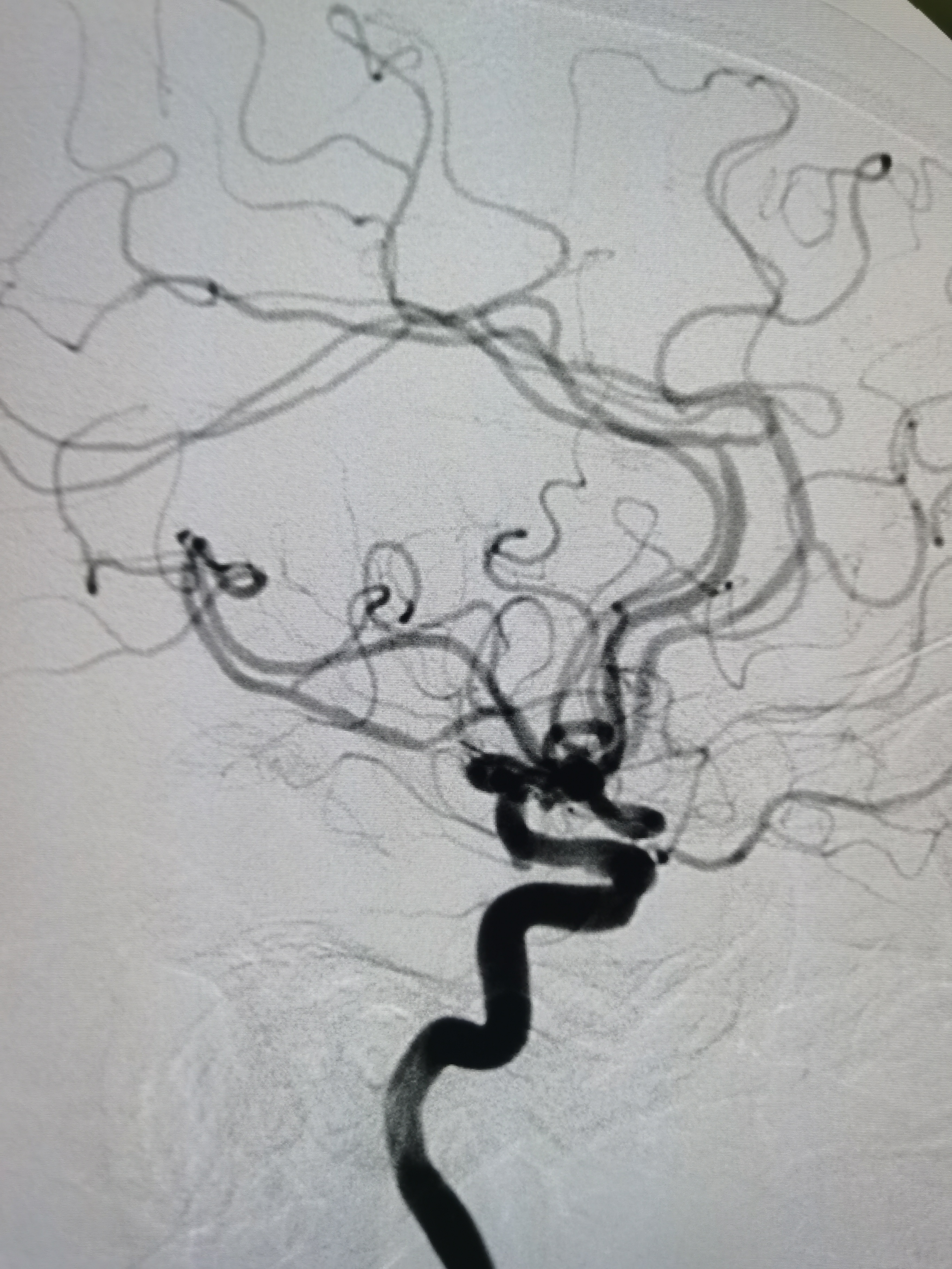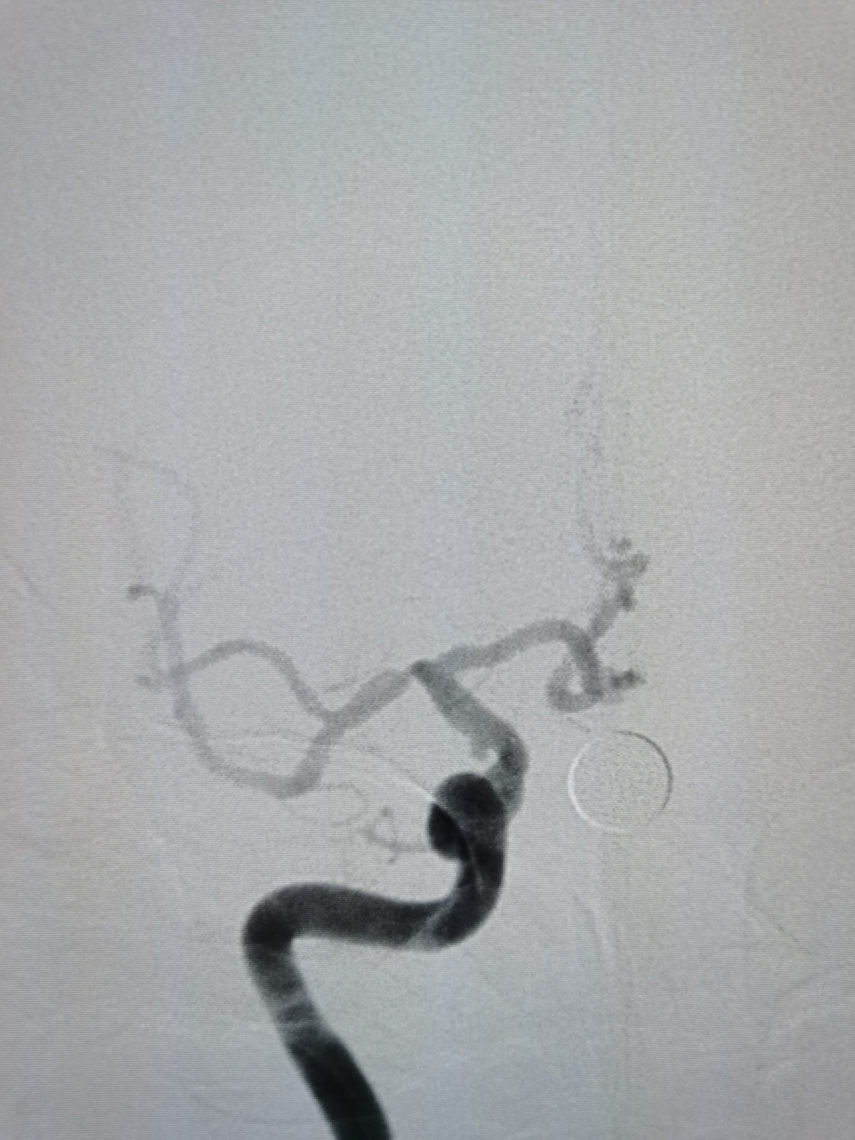 球扩后造影见狭窄解除,豆纹动脉显影良好,远端血供改善,未见夹层征象。