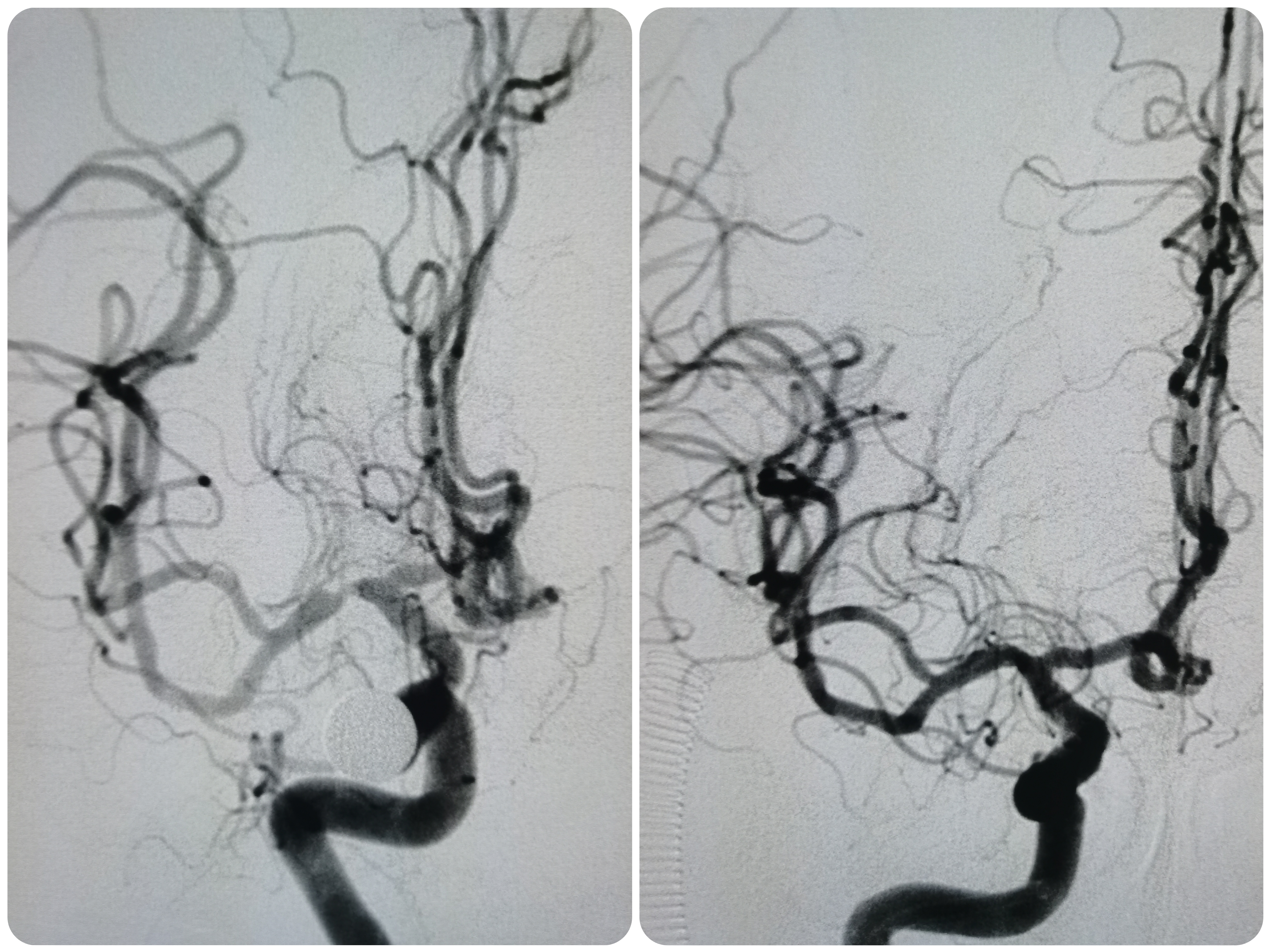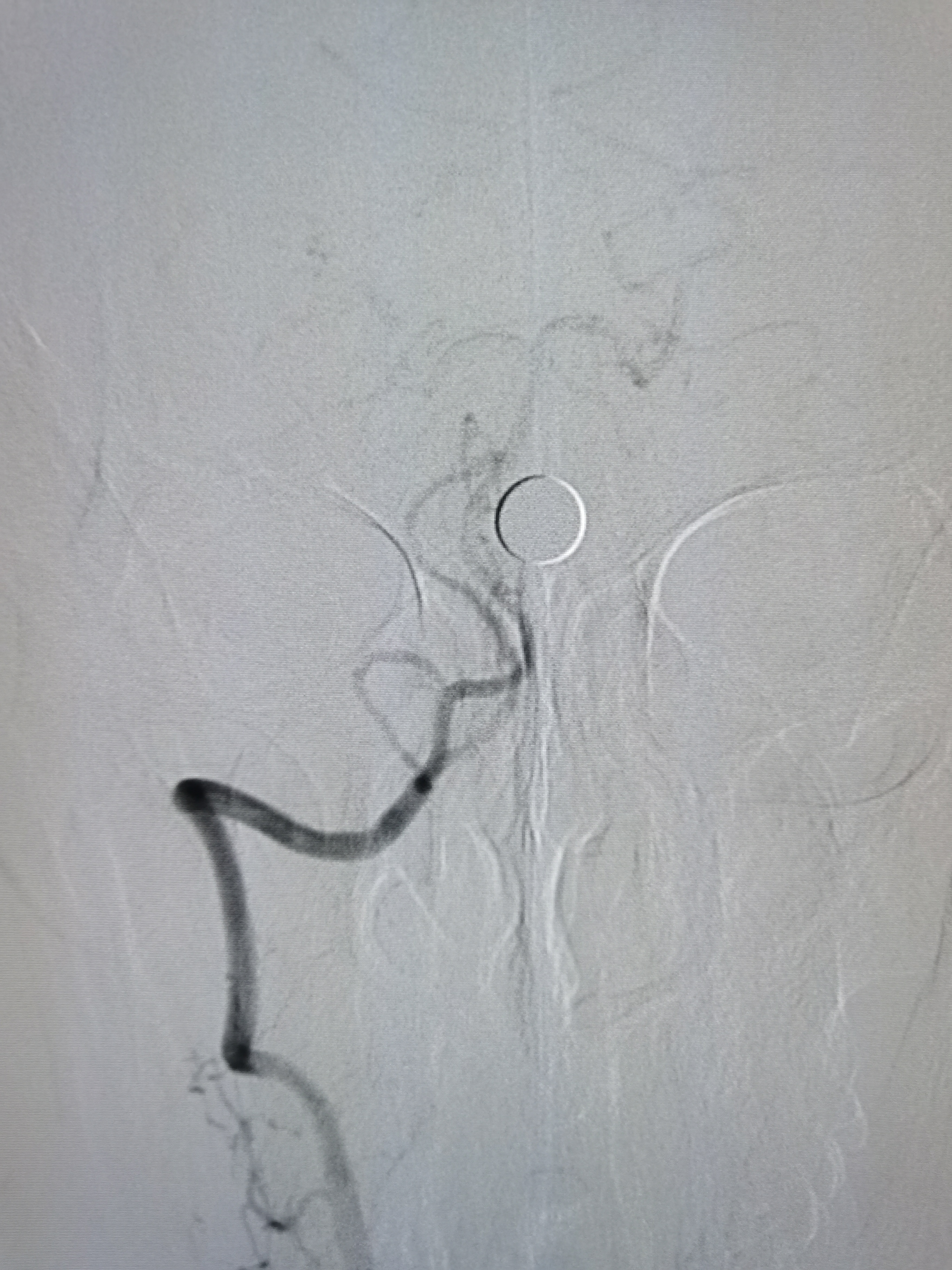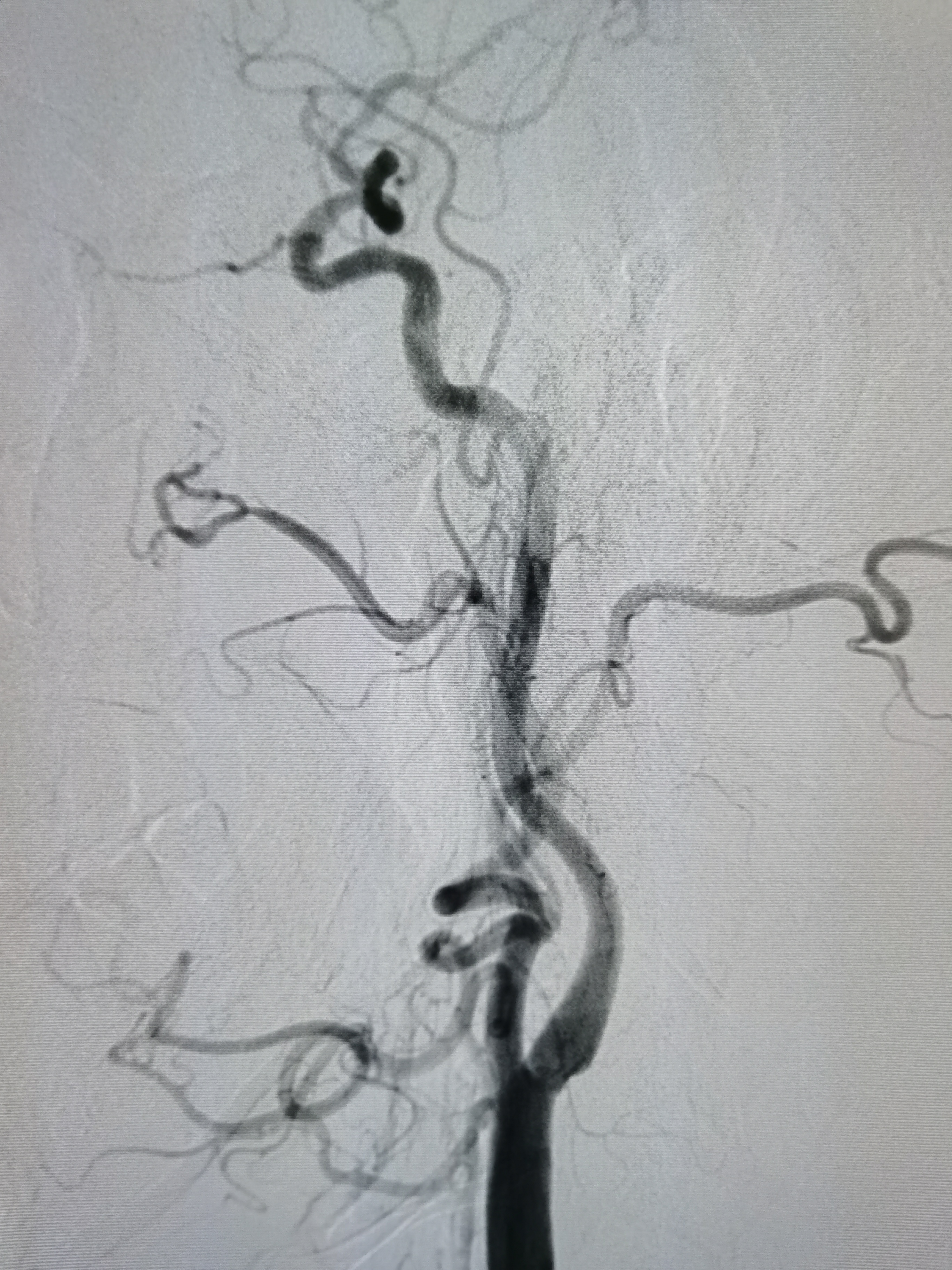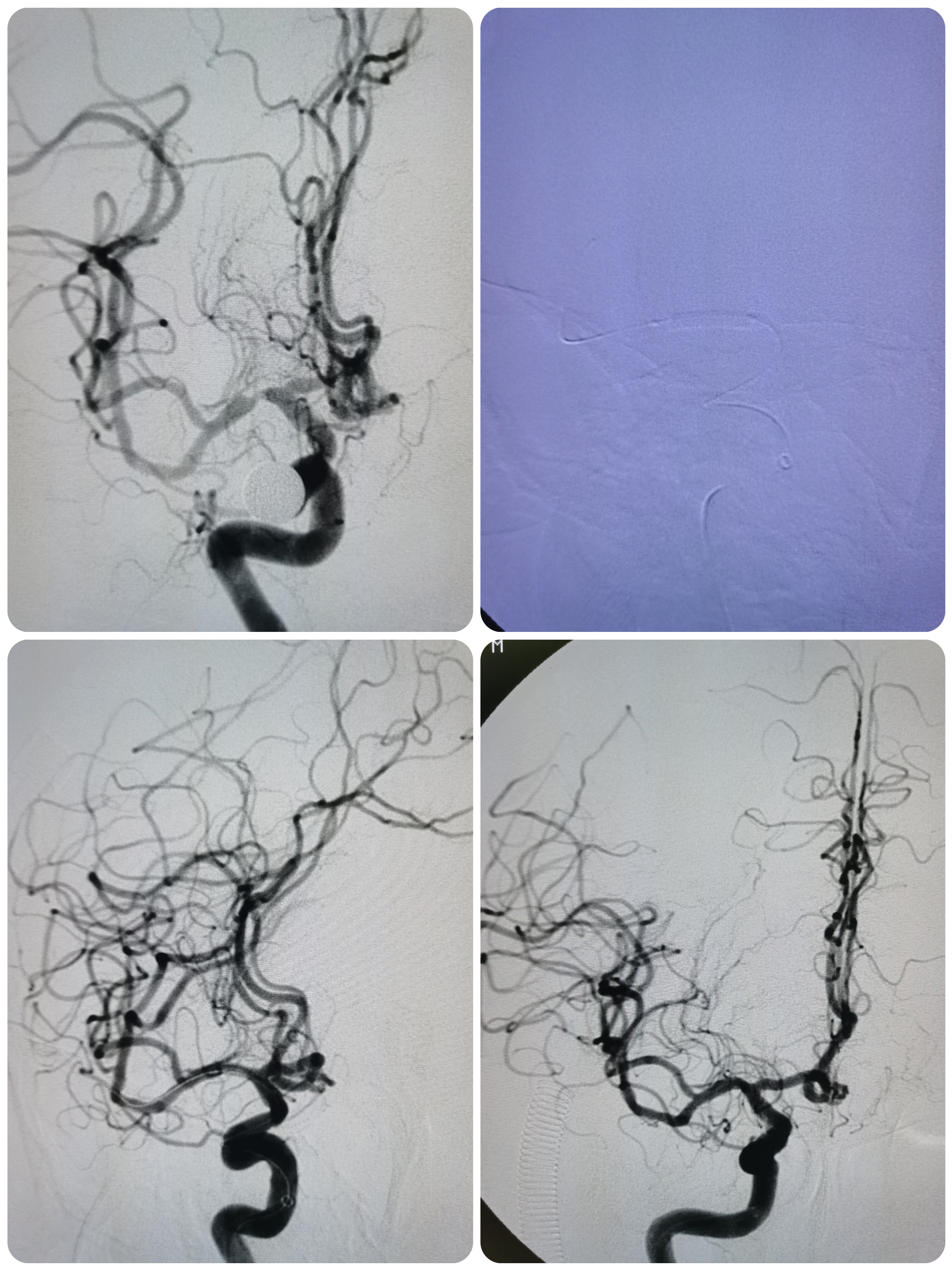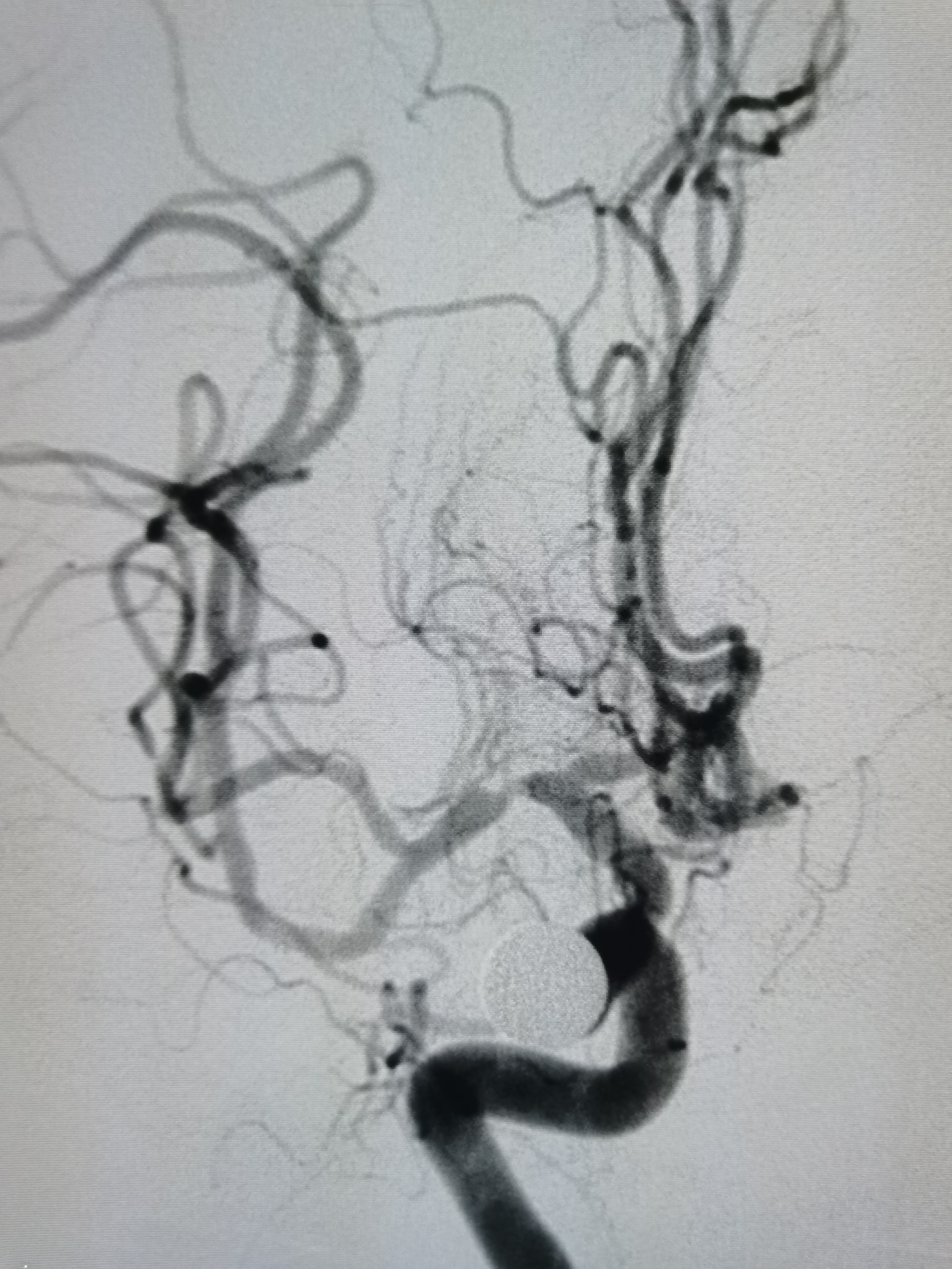 球扩后造影见狭窄解除,豆纹动脉显影良好,远端血供改善,未见夹层征象。