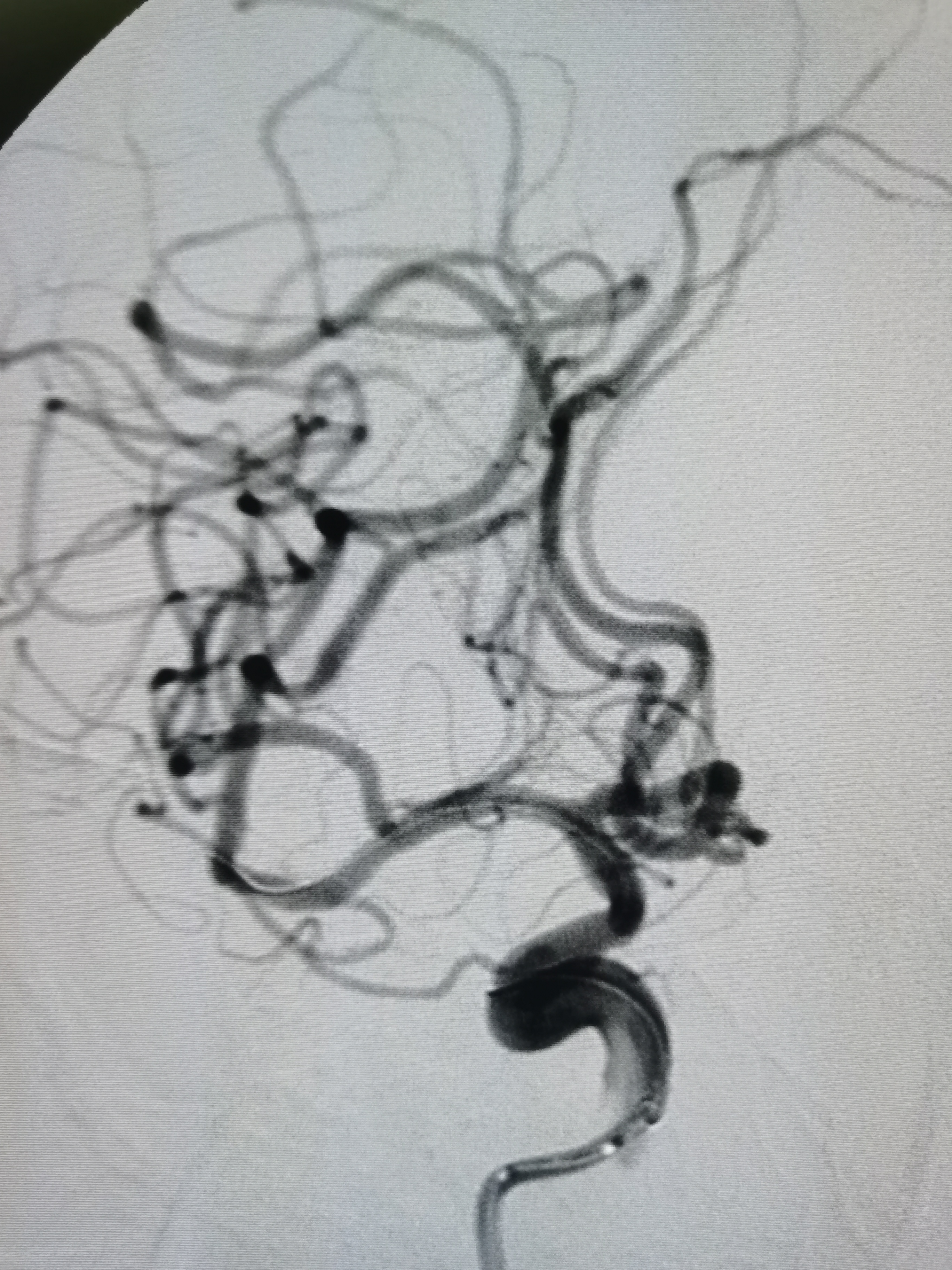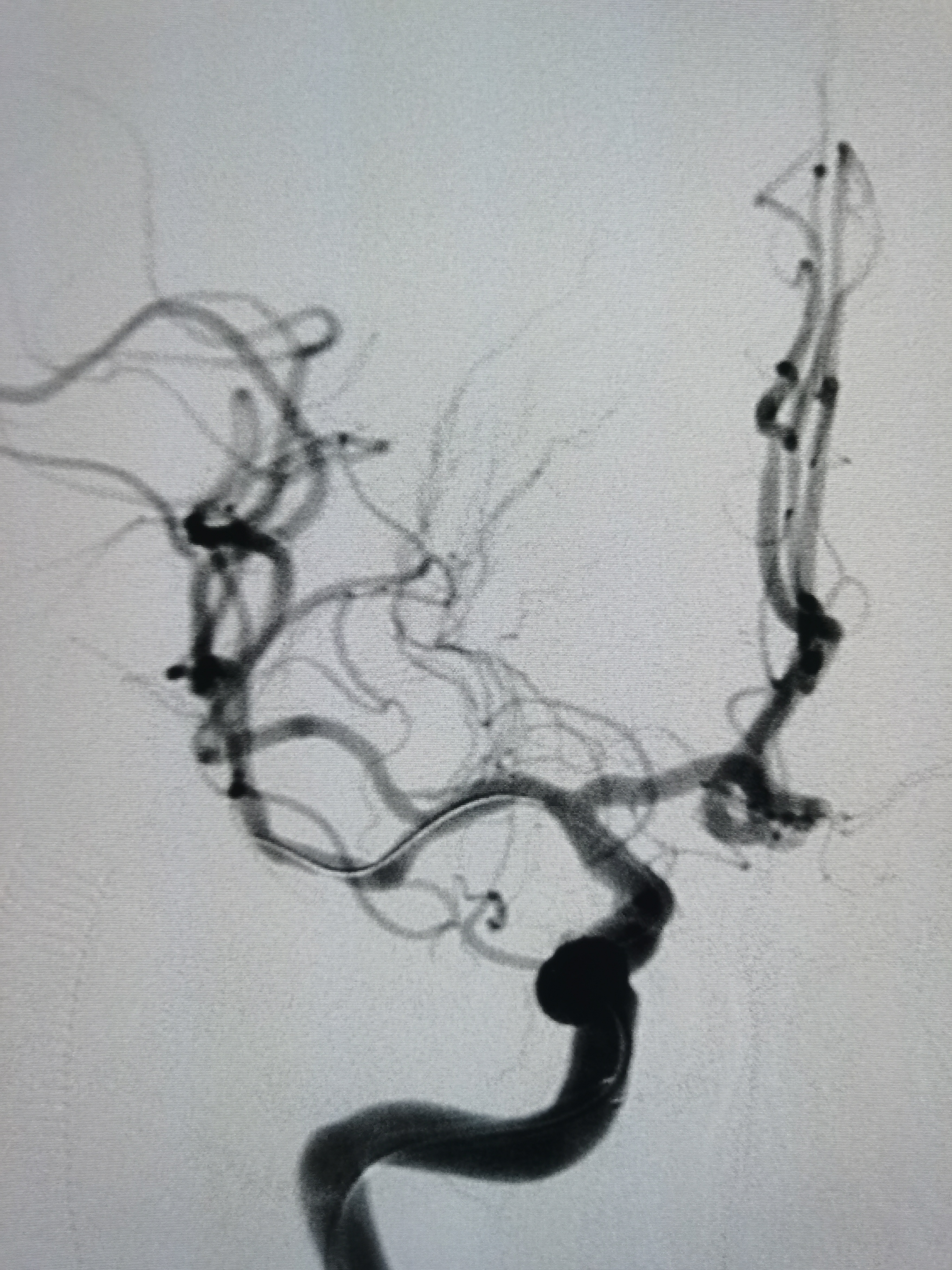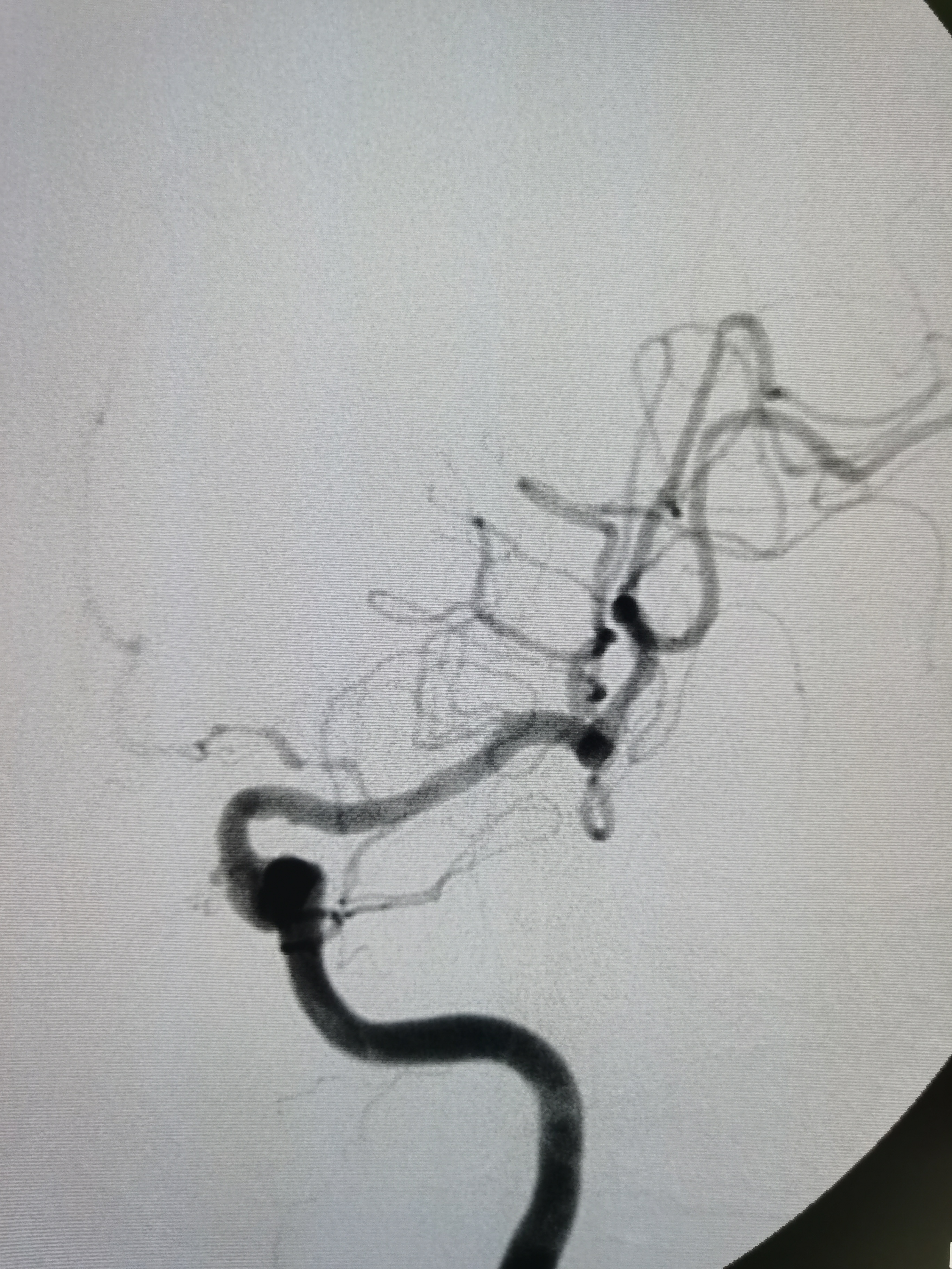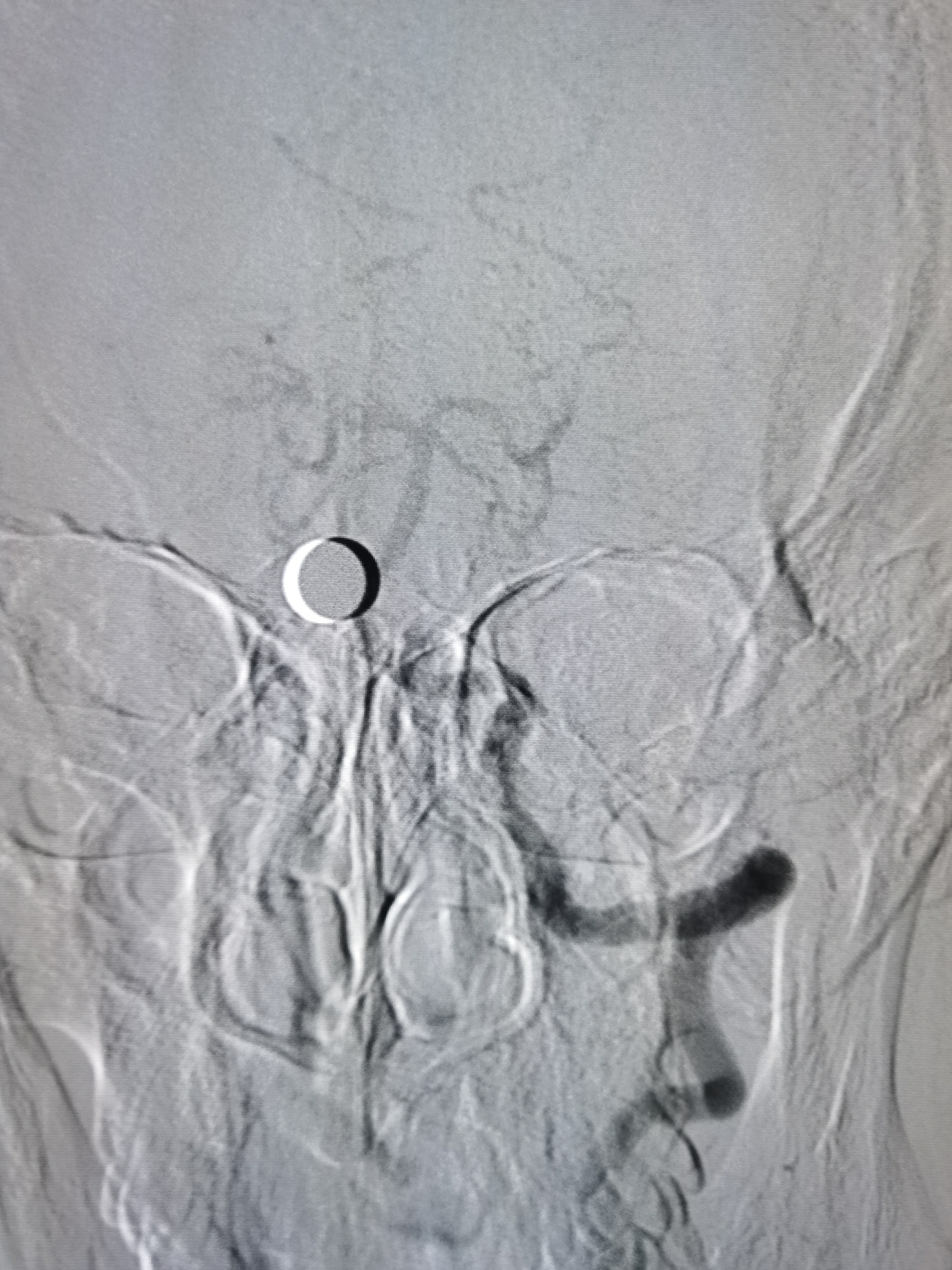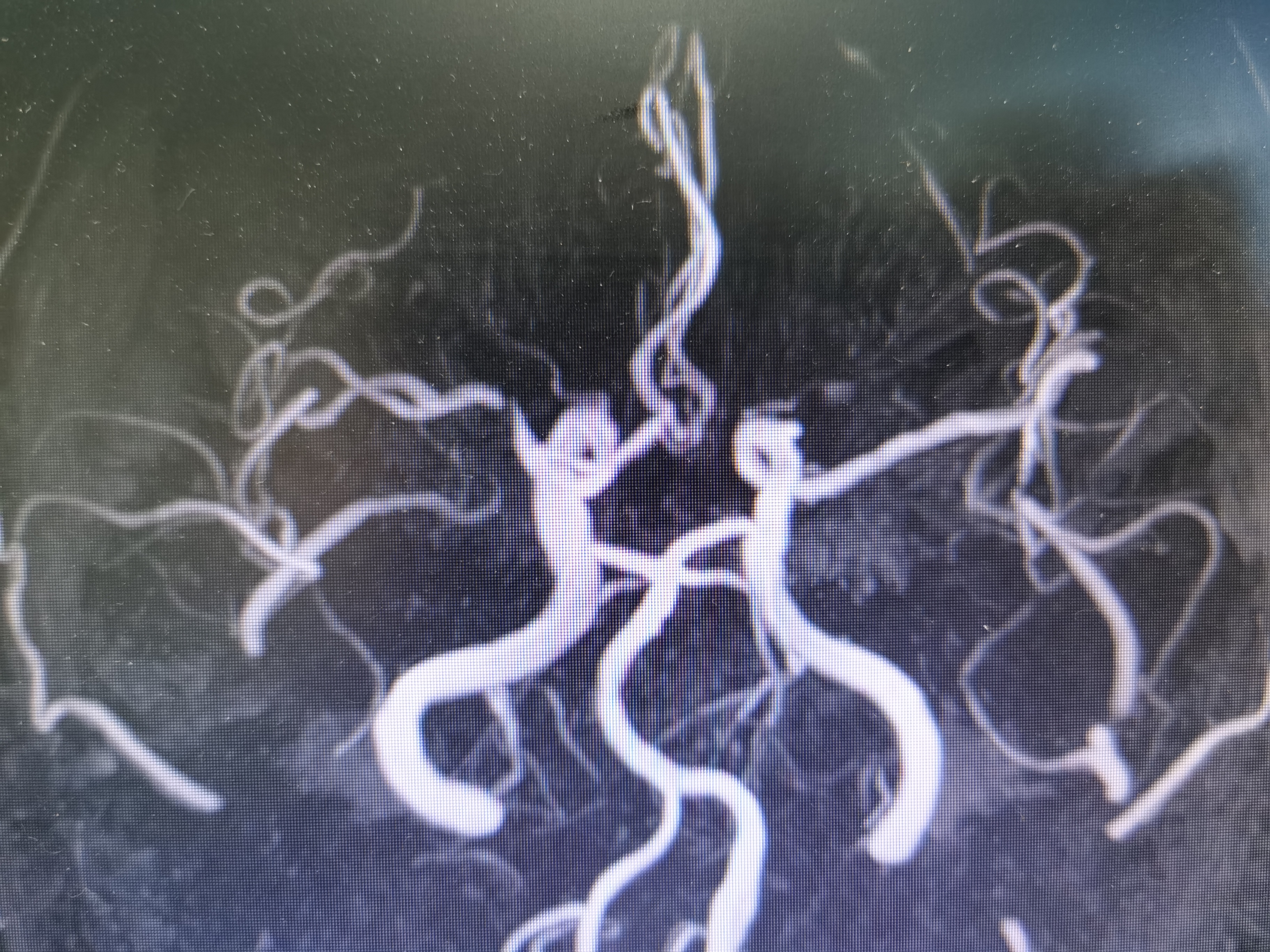 球扩后造影见狭窄解除,豆纹动脉显影良好,远端血供改善,未见夹层征象。