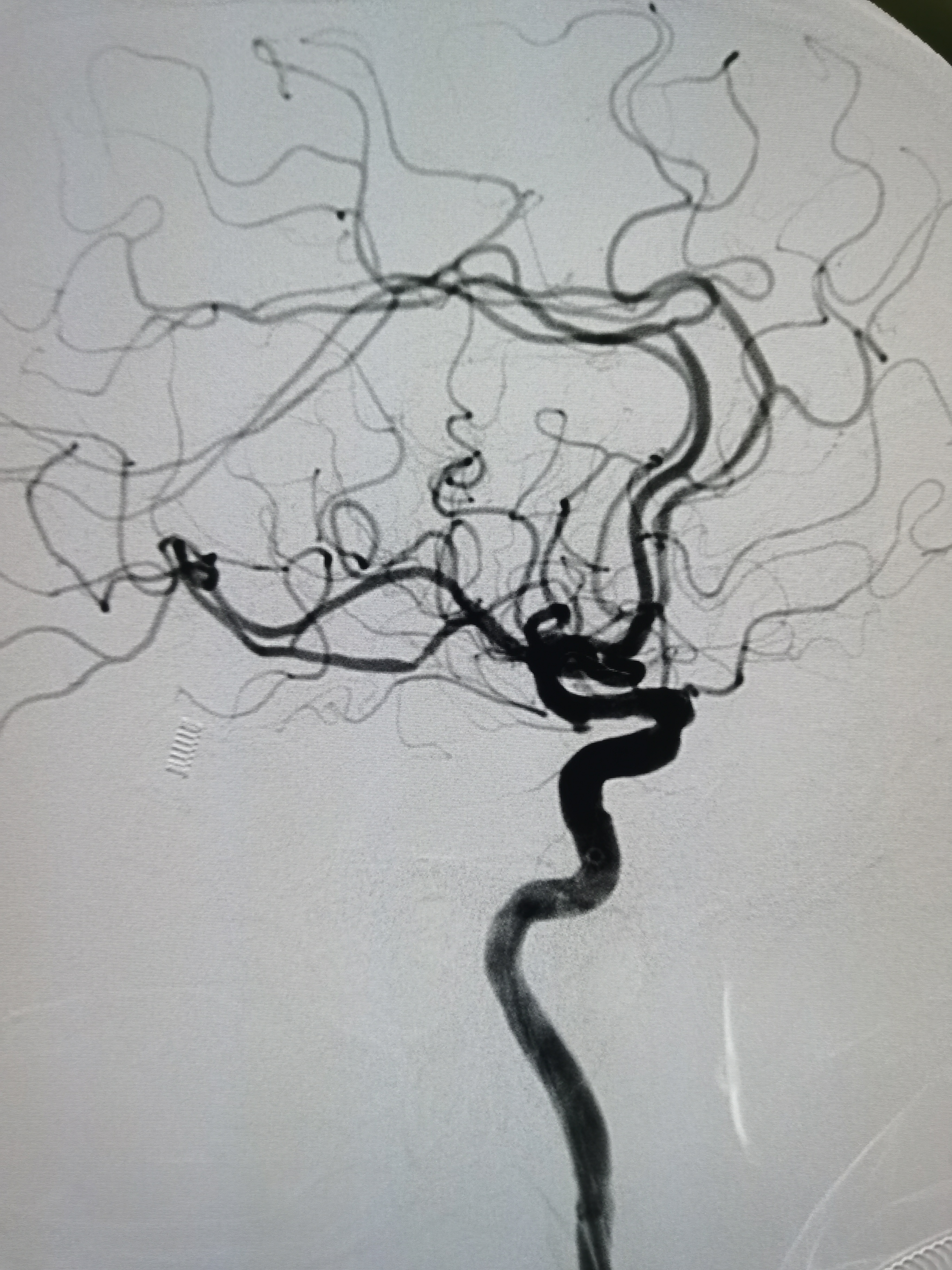 患者右侧大脑中动脉M1段重度狭窄,病变处存在豆纹动脉分支,具备介入治疗指征,手术风险在于血管夹层,破裂及穿支闭塞可能,向患者家属详细交代病情及风险后,家属积极要求介入治疗。拟行右侧大脑中动脉球囊扩张备支架成形术。
