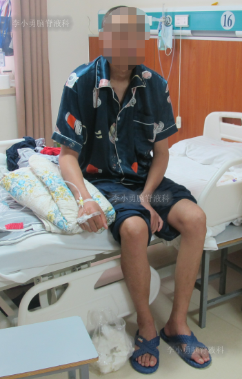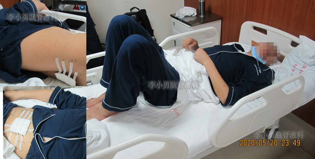 2020年5月20日(脑积水分流术后7天,发热7天),转住入北京北亚骨科医院的李小勇脑脊液科,入院时:发热,患者仍头晕,时有呕吐,精神差,饮食差,晚上睡眠差;背部腰穿术后,腹部有手术切口(图-9)。