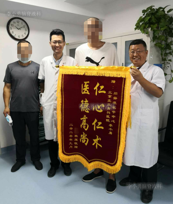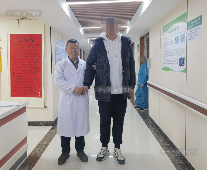 2020年9月2日(李小勇脑脊液科治疗105天)出院,出院时:自己走路速度稍慢,单腿站立不太稳(图-21);出院时头颅CT示未见异常(图-22)。