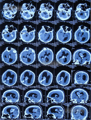入院时查头颅CT示脑室分流术后状态,脑积水,脑室有积血(图-10)。