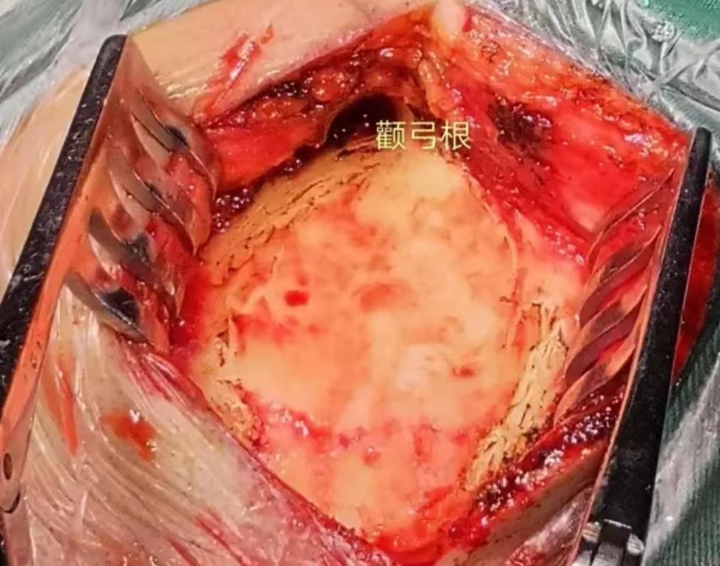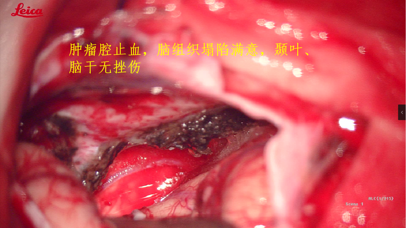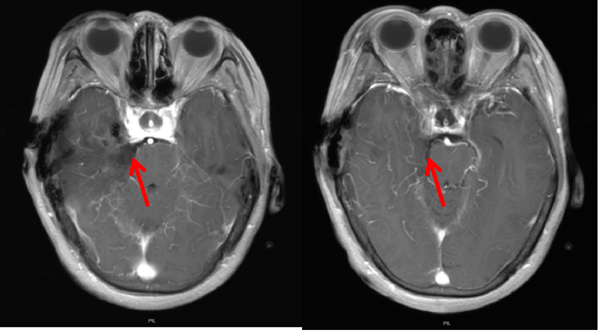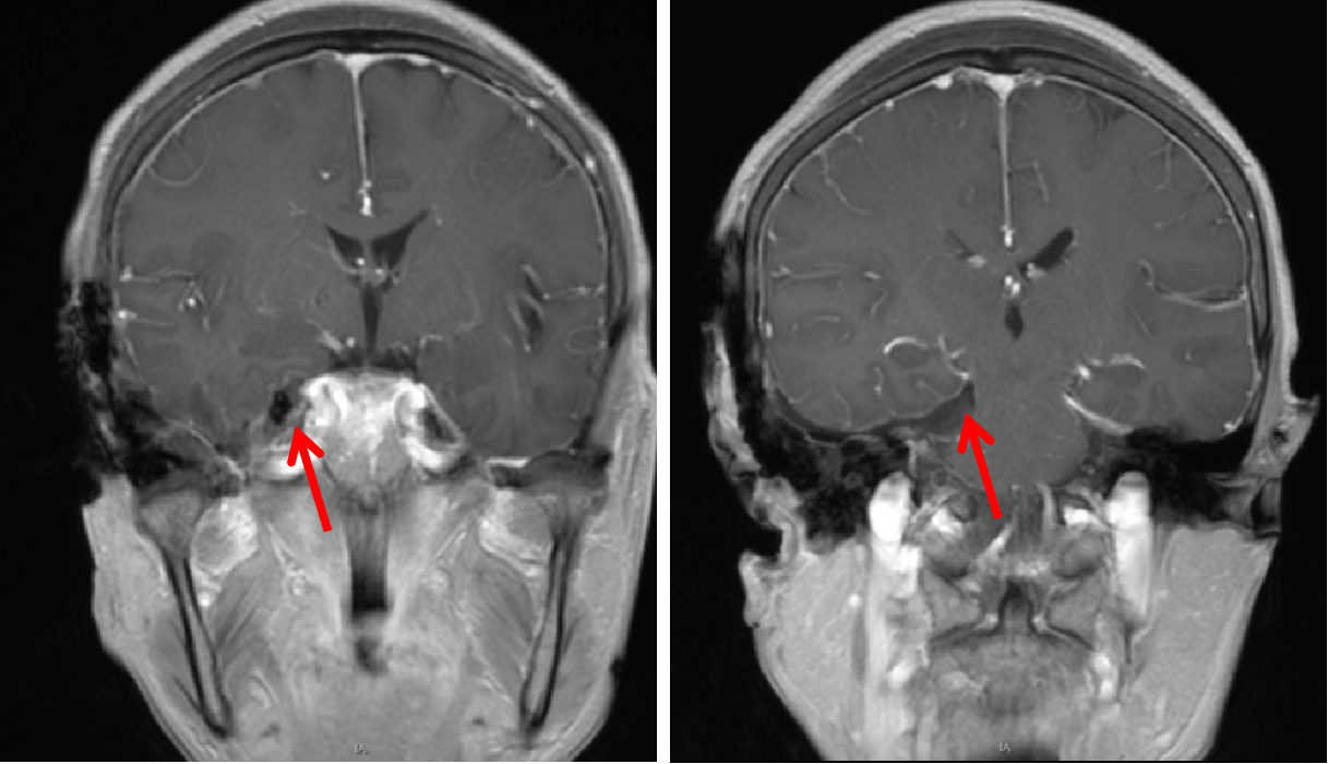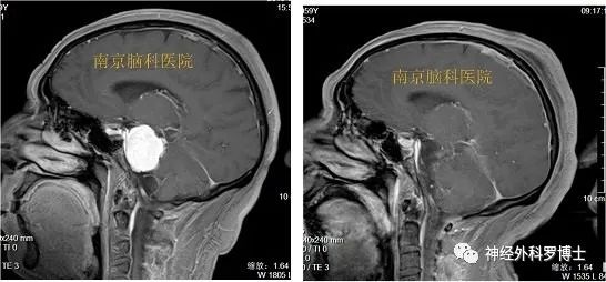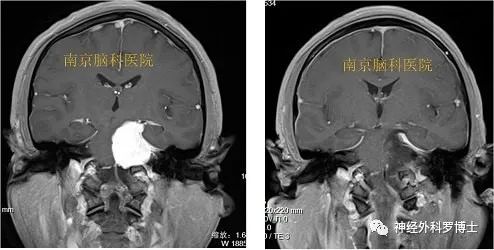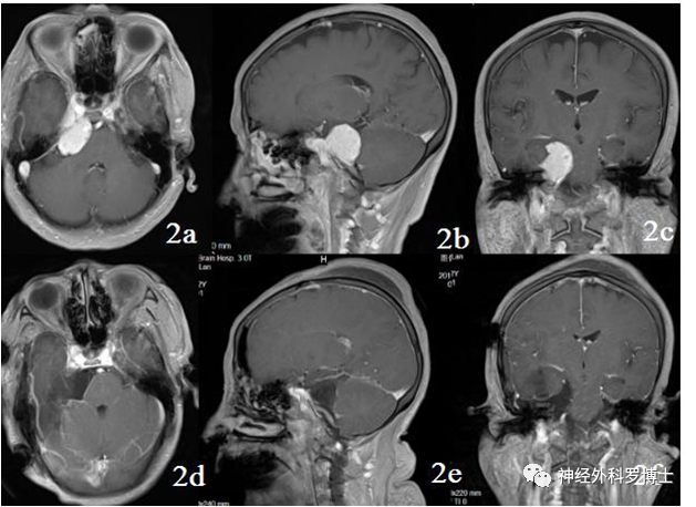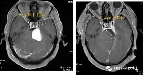 术前磁共振MRI增强显示中颅窝岩骨尖部和后颅窝(小脑幕下、斜坡)病变,术后1天磁共振复查显示肿瘤全切,无残留,术后患者恢复良好,没有不良症状发生。通过颞下经小脑幕入路一次手术全切病变,避免分期二次手术的痛苦。