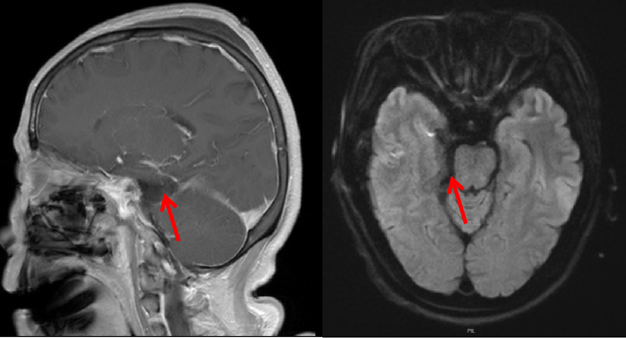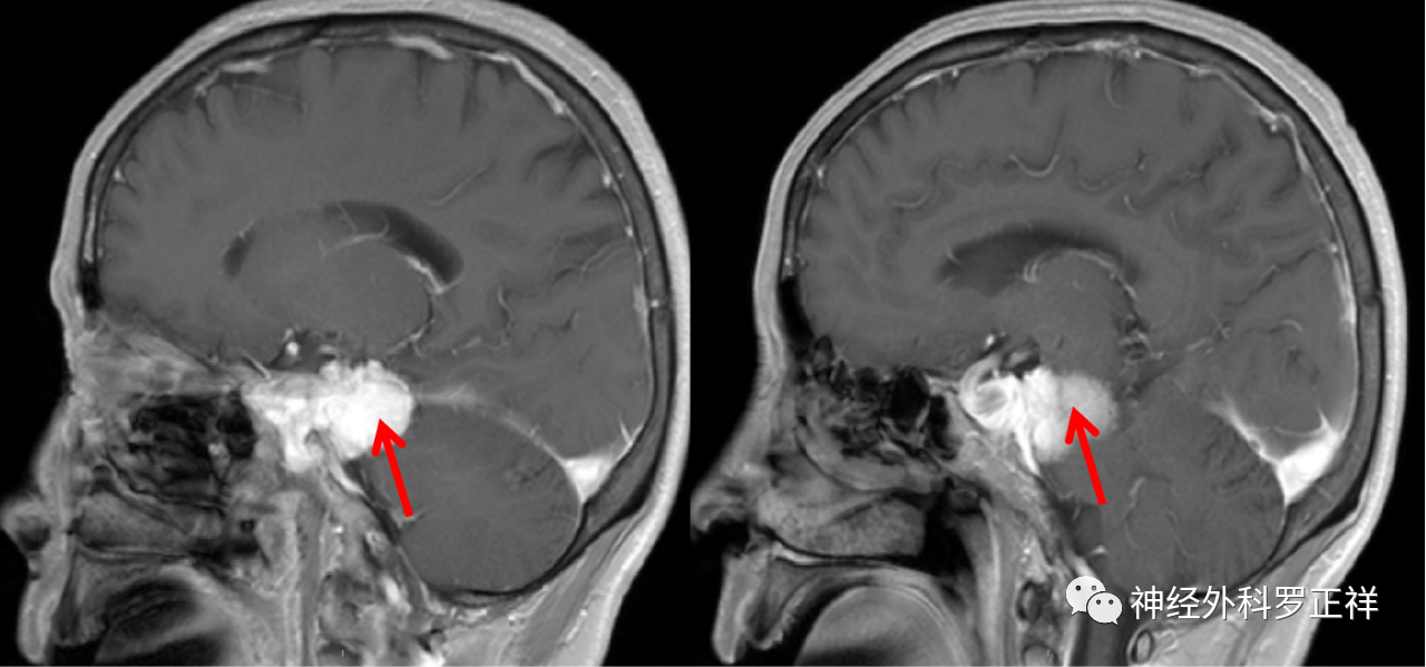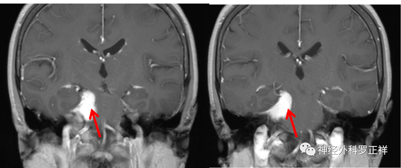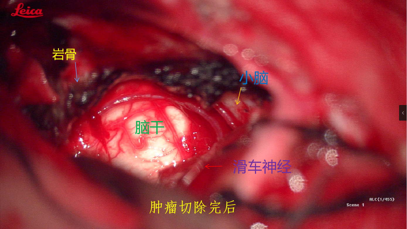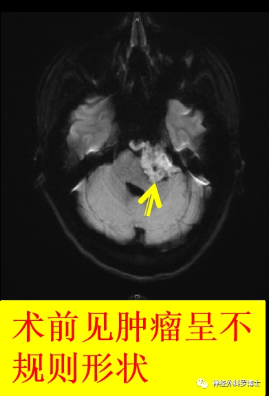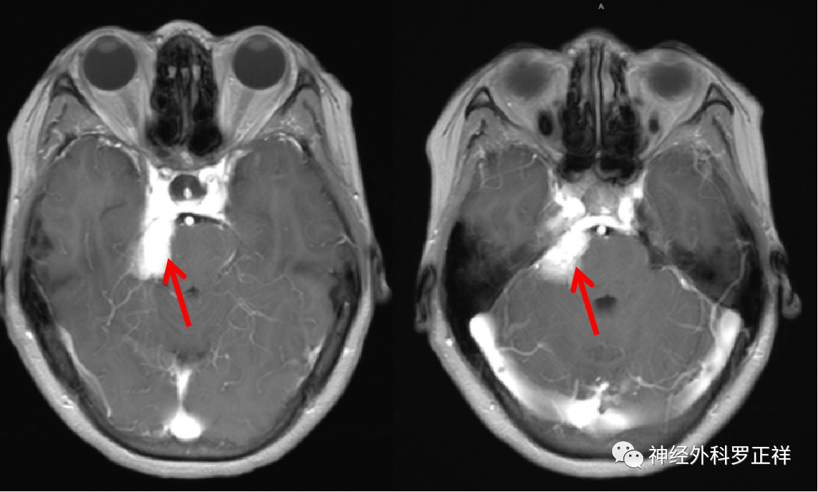 术前MRI提示肿瘤位于右侧岩尖,压迫脑干及三叉神经。