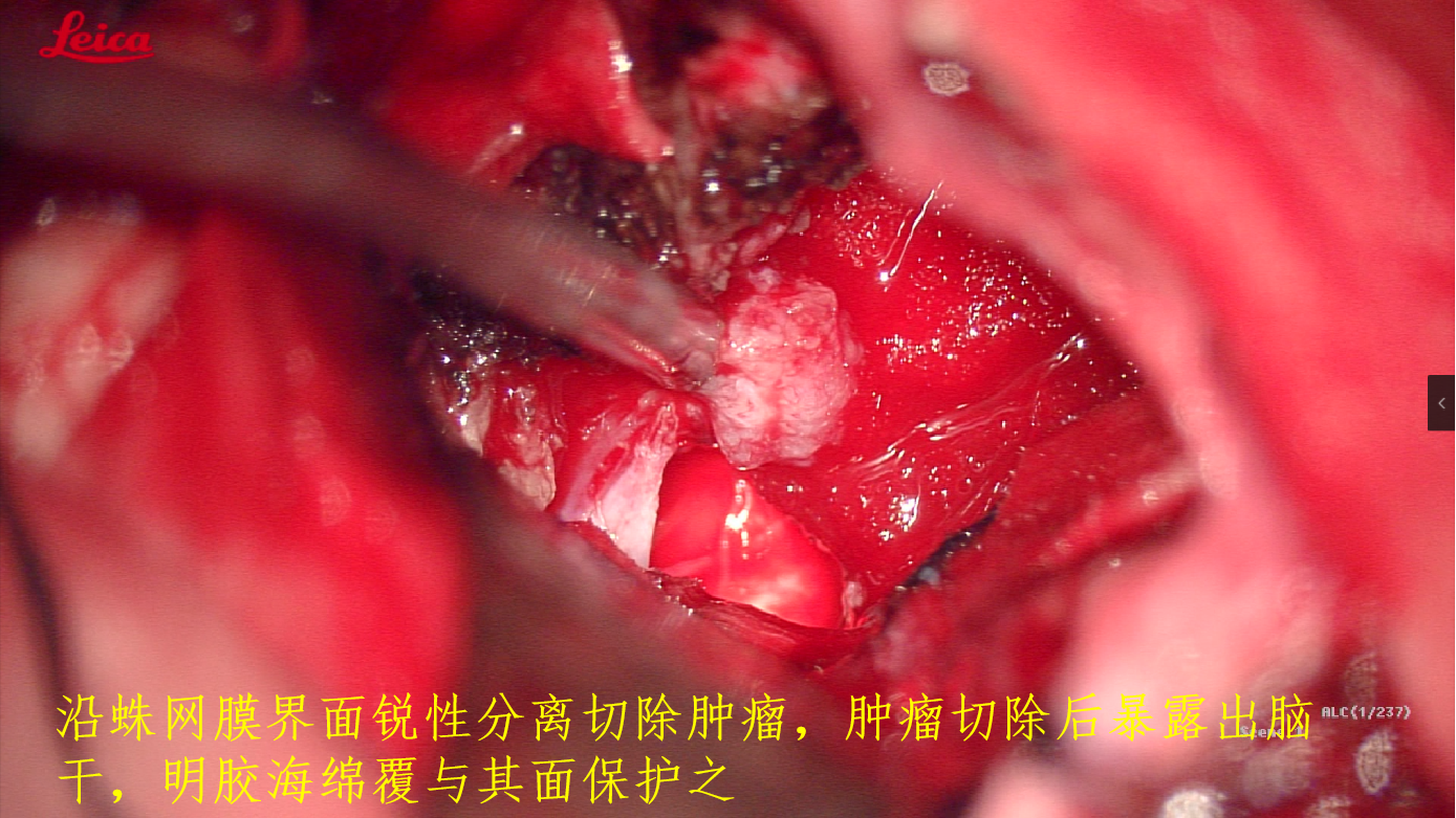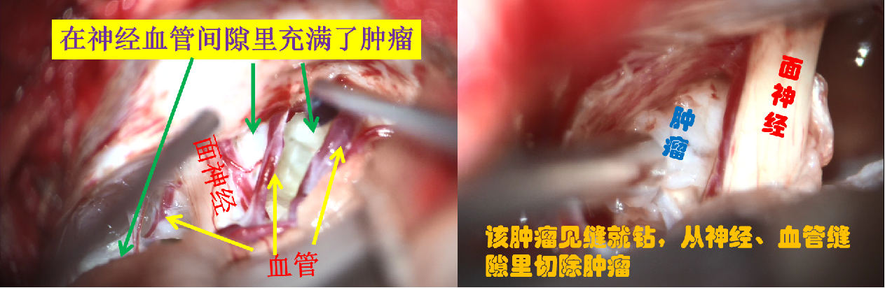 该肿瘤性质表皮样囊肿,或称胆脂瘤,因色成珍珠白,又称珍珠瘤。为先天性良性肿瘤,容易长在三叉神经走行的解剖区域,并且见缝就钻,长于神经、血管间隙里。