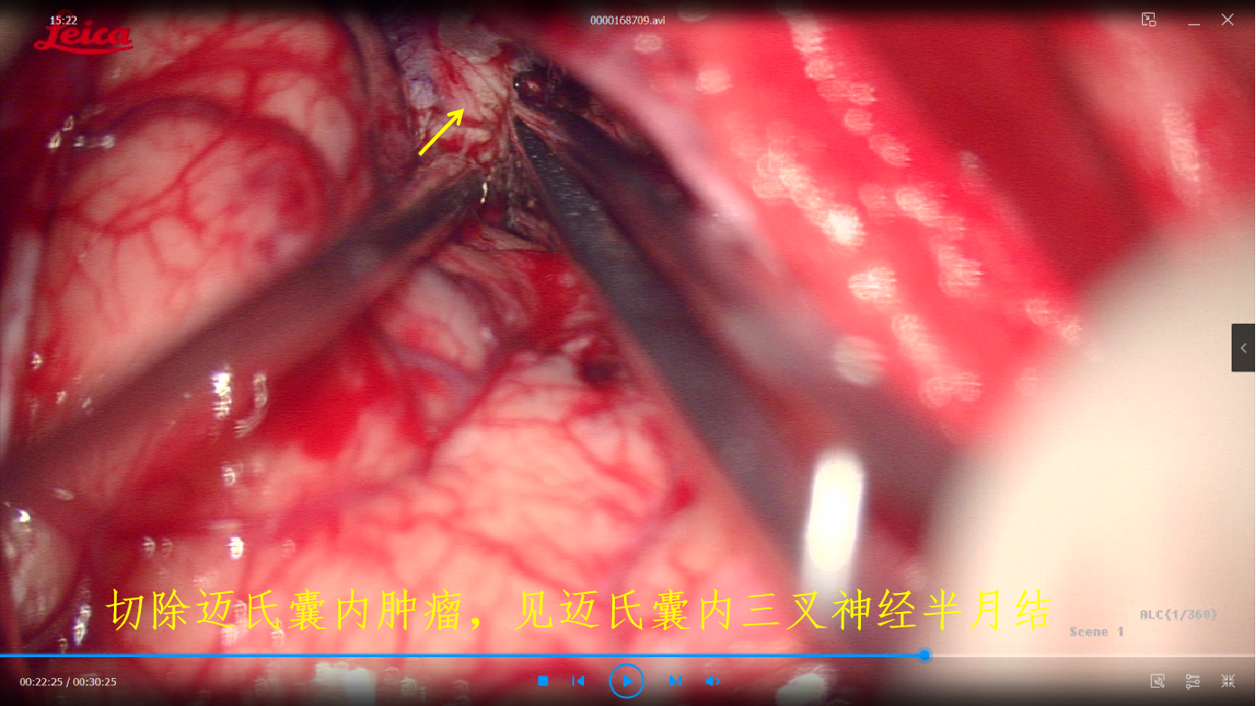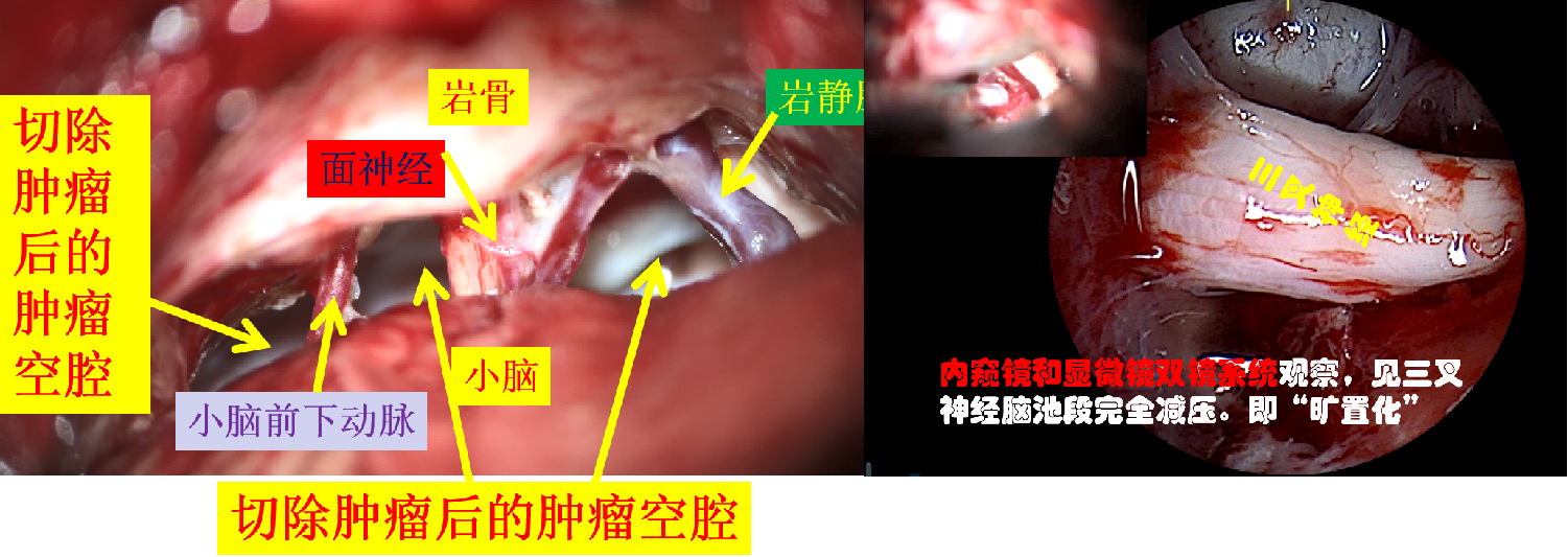 患者系33岁女性,安庆人,“三叉神经痛”多年,近期明显加重,磁共振检查发现是颅内肿瘤压迫三叉神经导致。应用“双镜”技术,显微镜、内窥镜结合,有利于发现并全切除肿瘤,并且把三叉神经在脑池段的走行完全减压出来。患者肿瘤切除后,疼痛也完全消失。
