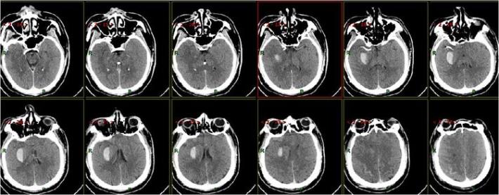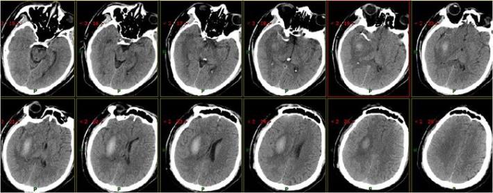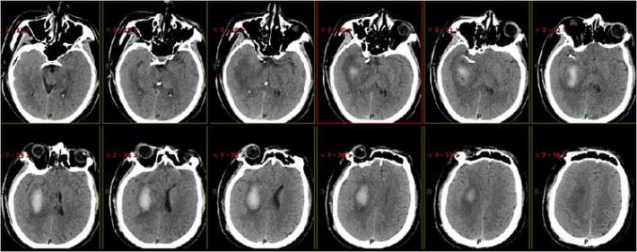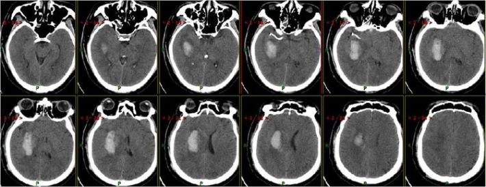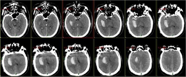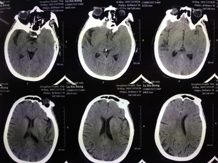 5月20日患者再次出现意识不清,神志浅~中昏迷,双侧肢体刺激后可稍屈曲,NIHSS评分: 17分,Glasgow评分: G1M2V1。