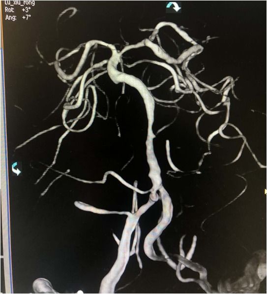 急诊MRA示:基底动脉尖丢失,决定急诊取栓再通。