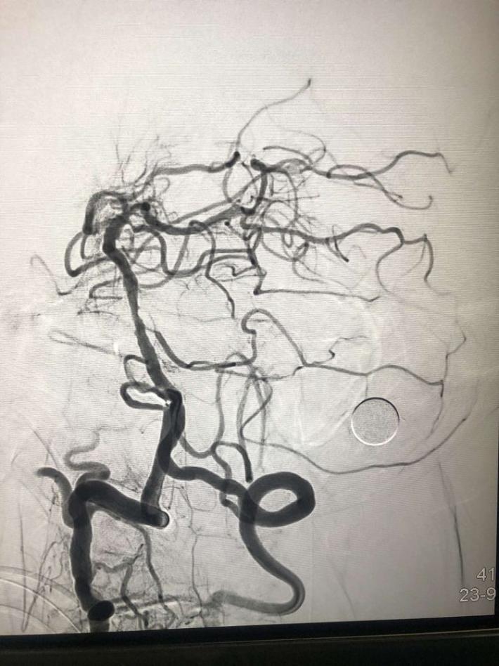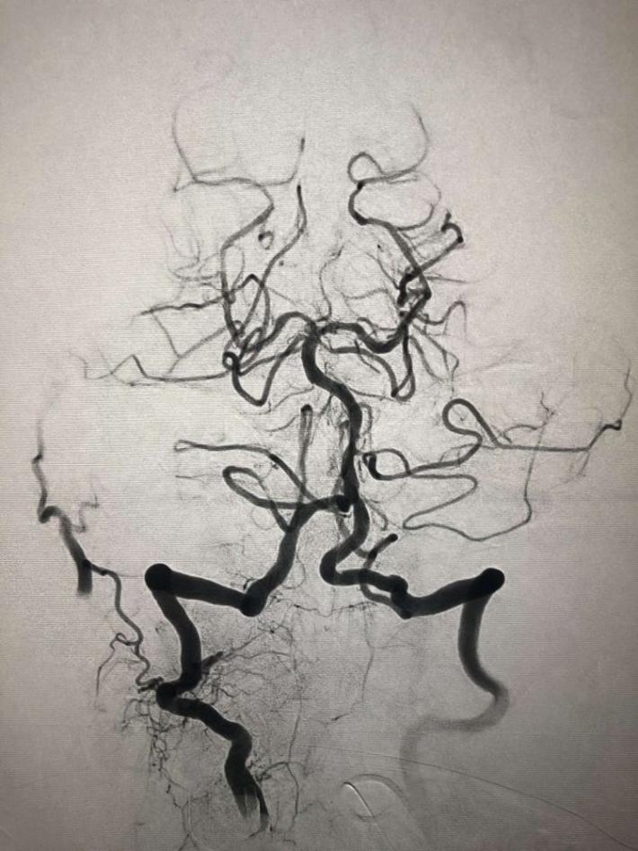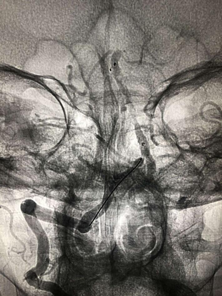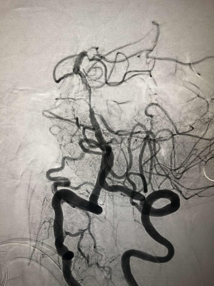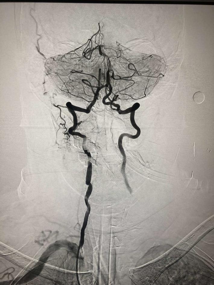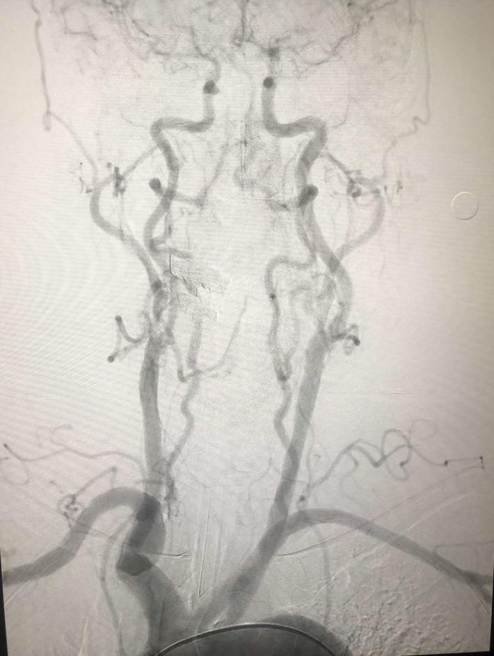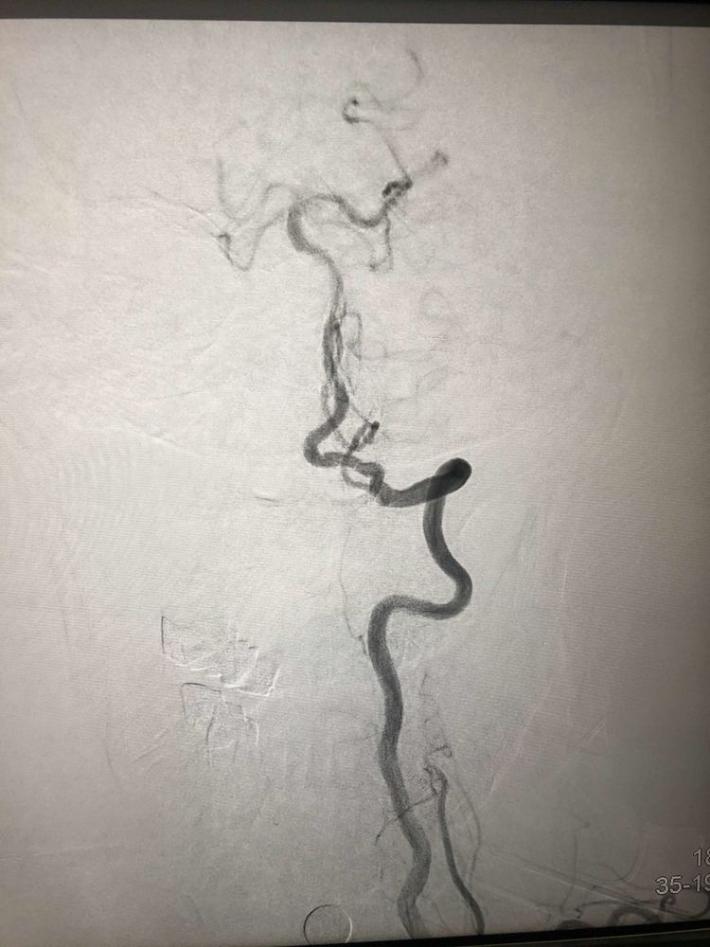 一把拉通后,前向血流即刻恢复至3级,双侧小脑上动脉、大脑后动脉、基底动脉尖显影。